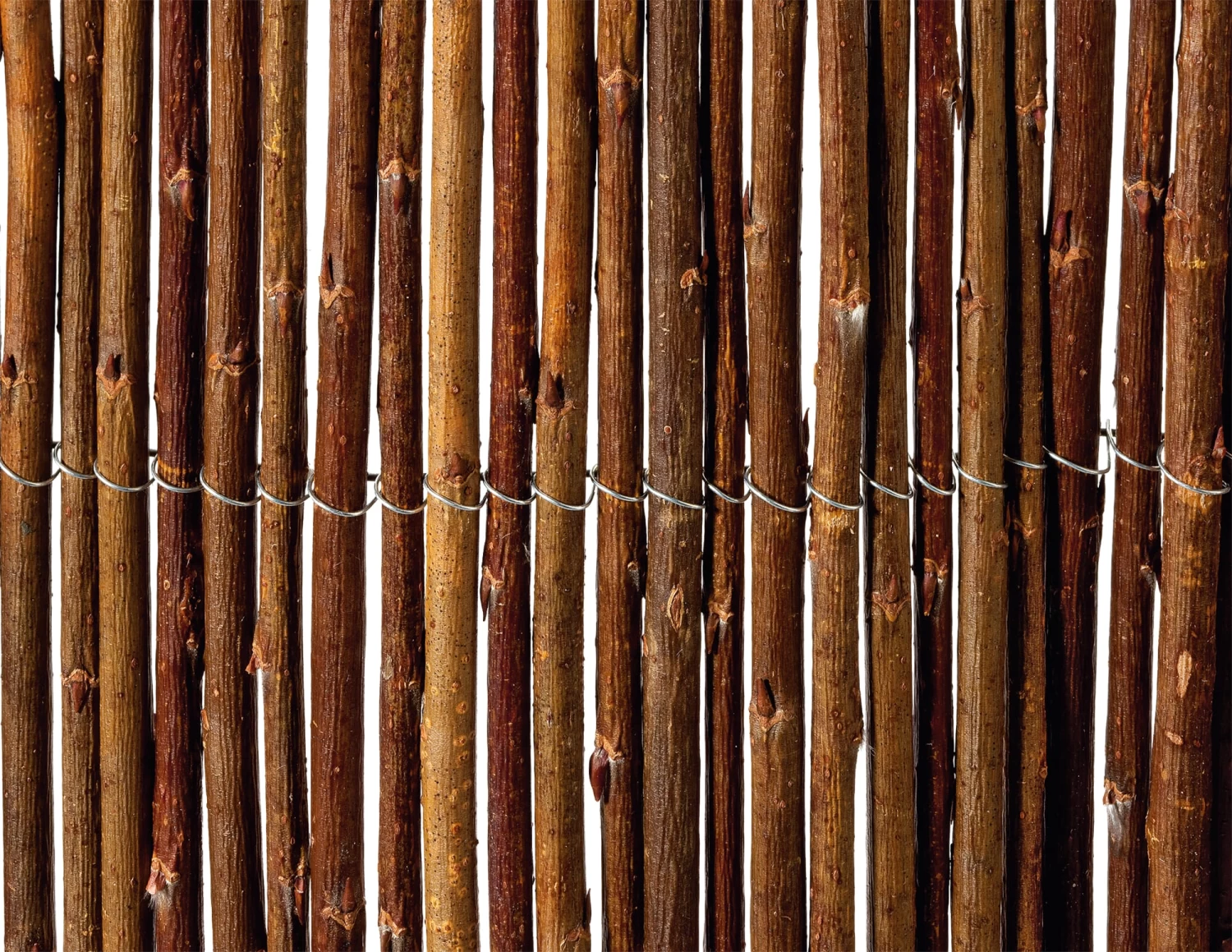 Natuurlijke wilgenstokken (Ø ca. 5 mm). thermisch verzinkt staaldraad. Matlengte 3 m elk. Verkrijgbaar in twee maten.