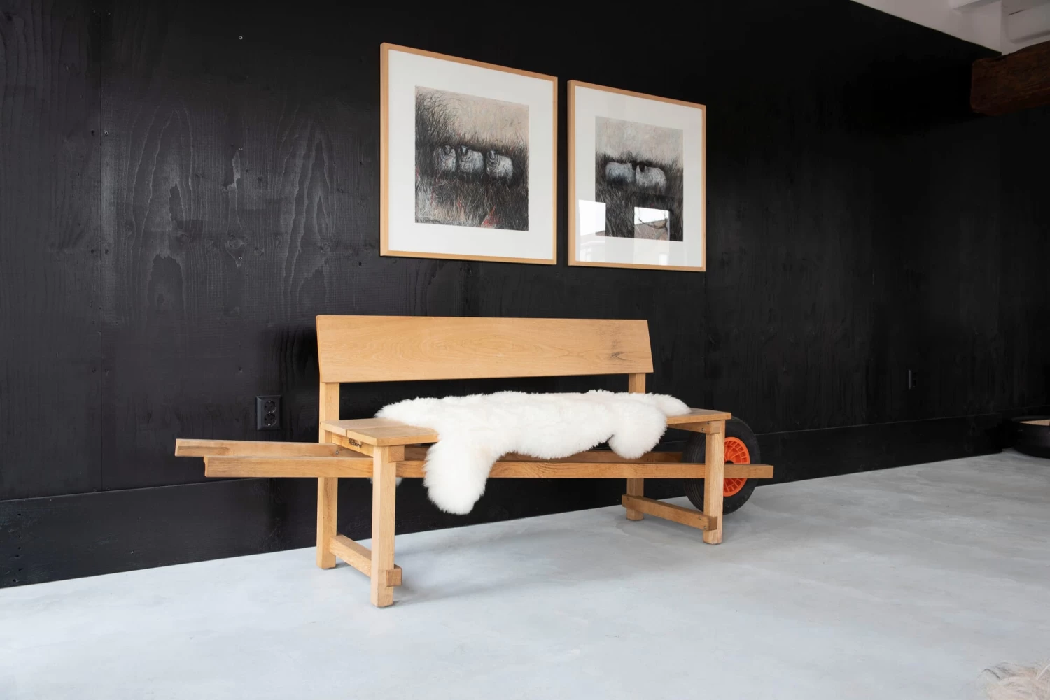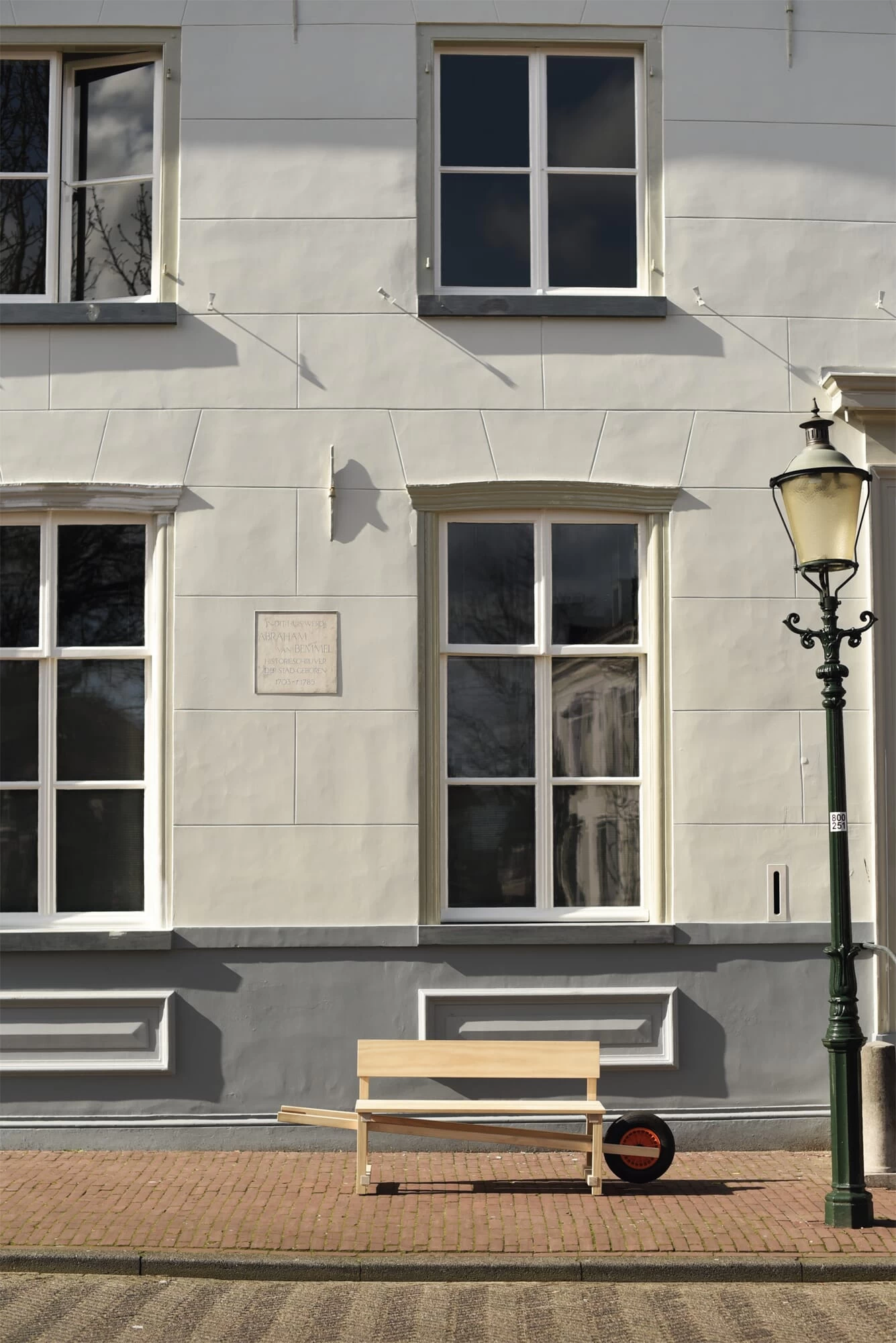 Afmetingen: B 215 x D 45 x H 70 cm, zithoogte: 45 cmGewicht: 25 kgMateriaal: hout: eiken, (herkomst: Nederland), onbehandeld; wiel: polyamide, rubberDesign: Rogier Martens