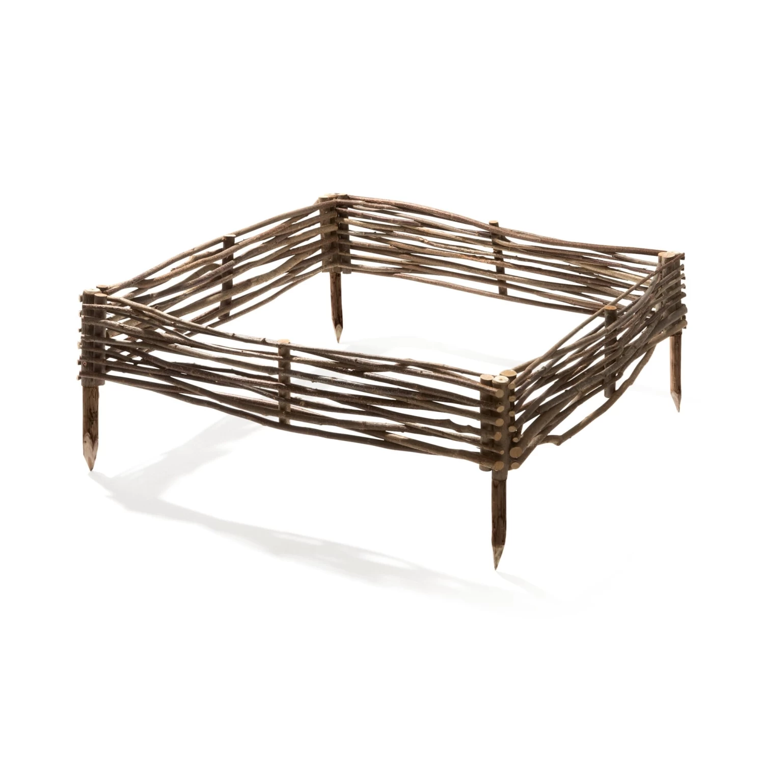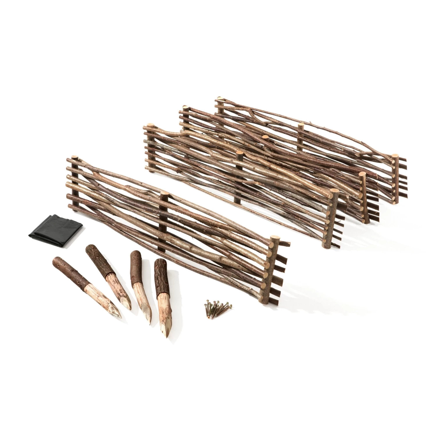 Vier zijelementen van hazelaarstaven en vier palen van hazelaarhout, PE-folie, voor het bouwen van een vierkante rand. Geleverd met bevestigingsmateriaal, zonder inhoud.