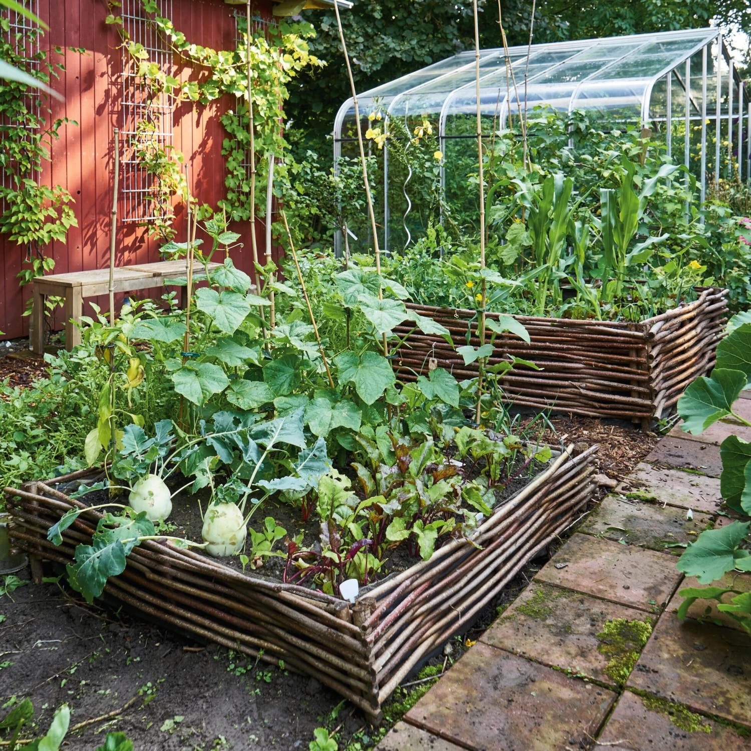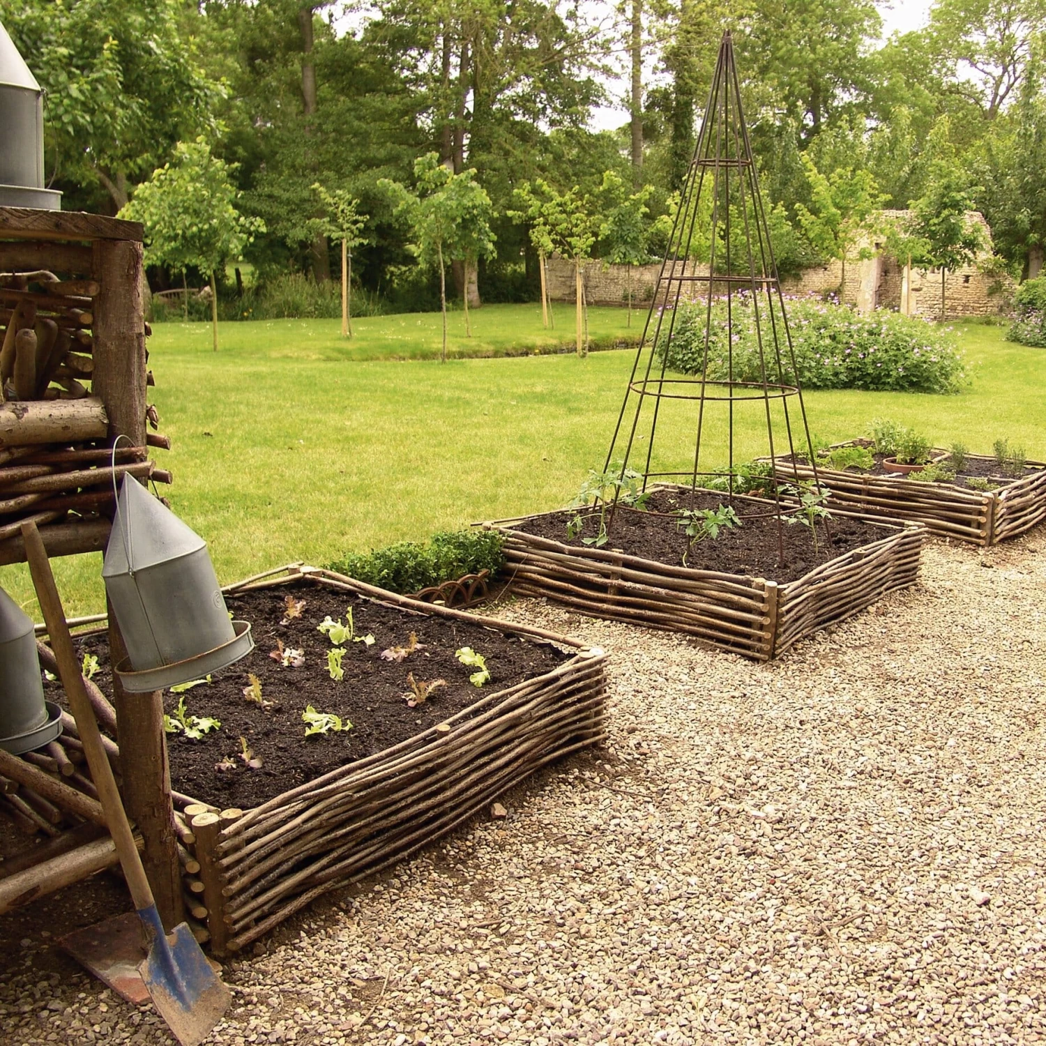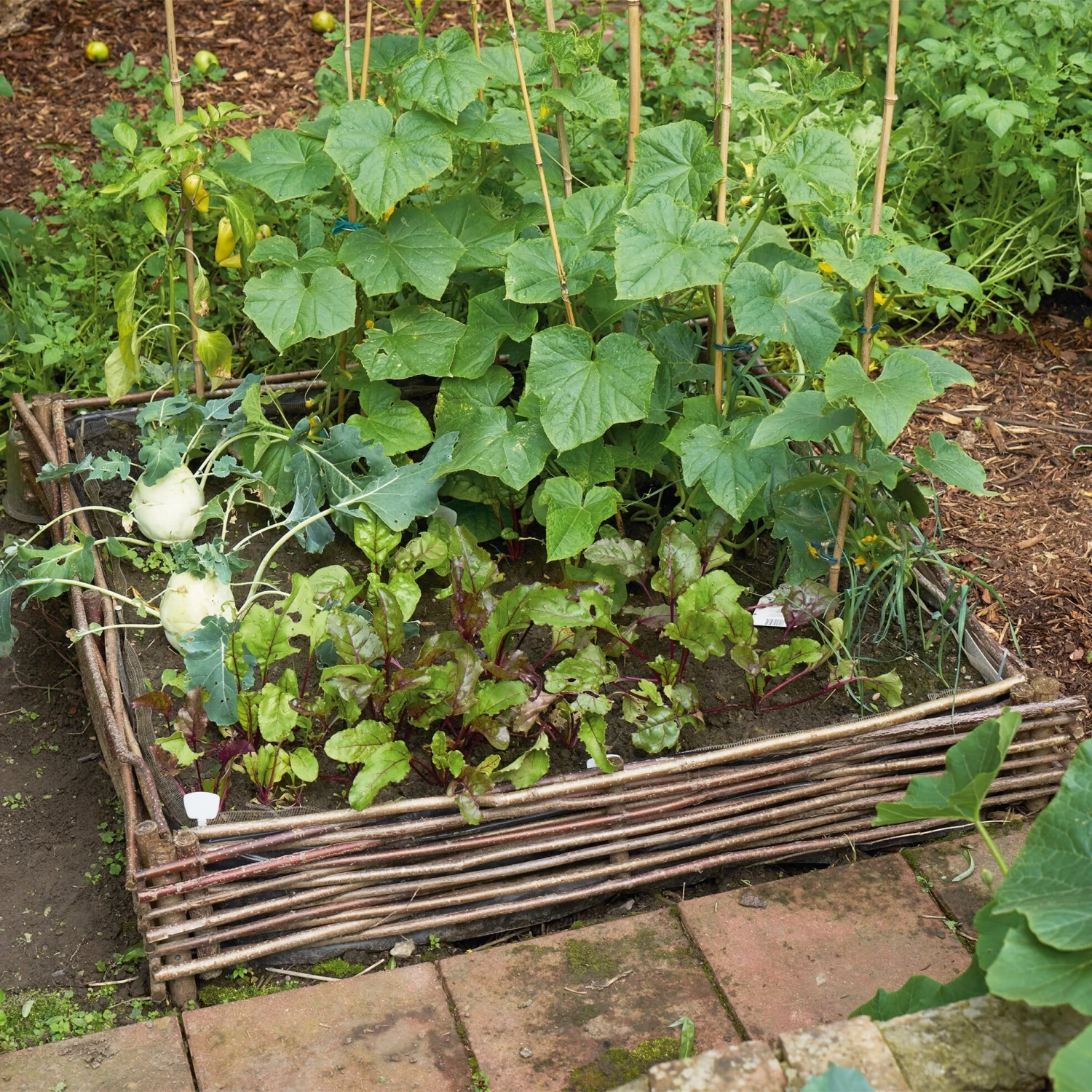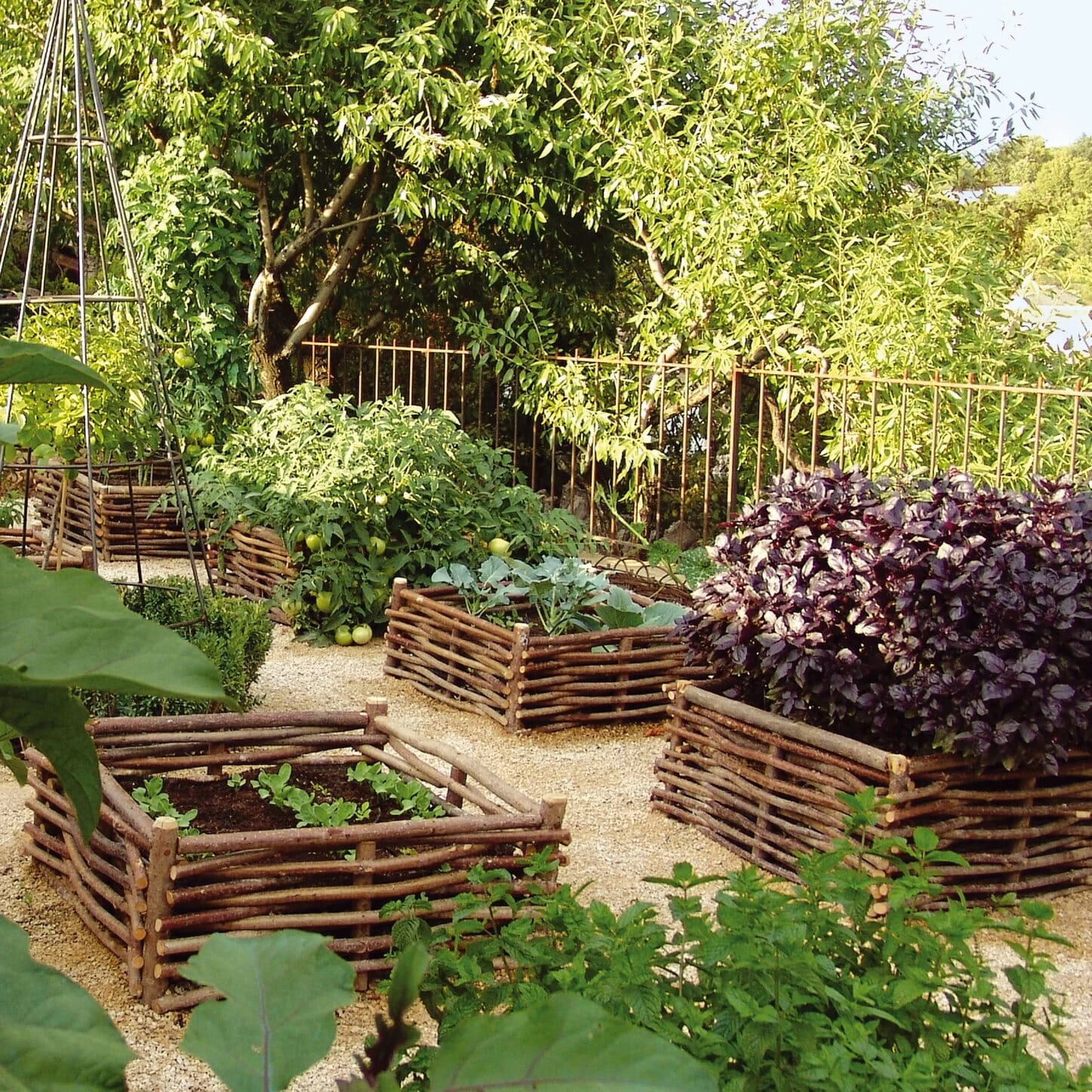 De traditie om bedden – meestal kleinere, vierkante – te voorzien van hekken van gevlochten hazelaarstaven is eeuwenoud. In middeleeuwse boerderij- en kloostertuinen werden ze bijvoorbeeld gebruikt om apothekerskruiden te scheiden van culinaire kruiden om te voorkomen dat de voorraden zich vermengden. Bovendien zijn onkruid, ongedierte en ziekten gemakkelijker onder controle te houden in de enigszins verhoogde en overzichtelijke bedden. Tegenwoordig kunnen afrasteringen een heel ander doel dienen: Met hun hulp kunnen kleine kruidentuintjes worden aangelegd in elke stedelijke achtertuin, geheel onafhankelijk van de kwaliteit van de grond. Daartoe plaatst u het frame gewoon op de grond – bijvoorbeeld ook op beton of grind – (de palen moeten daartoe worden ingekort), bekleedt u het met de bijgevoegde folie en vult u het met goede grond. De afmetingen van de rieten elementen kunnen licht afwijken.