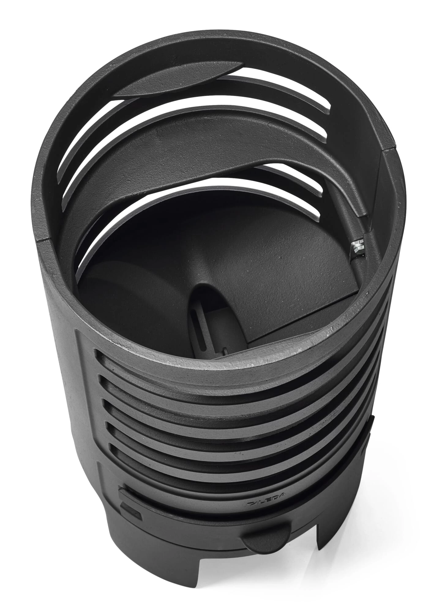 Gelakt gietijzer. Hoogte 61 cm, Ø 30 cm. Gewicht ongeveer 38 kg. De brandtoren wordt geleverd in twee handige dozen en is zeer gemakkelijk ter plaatse te monteren.
