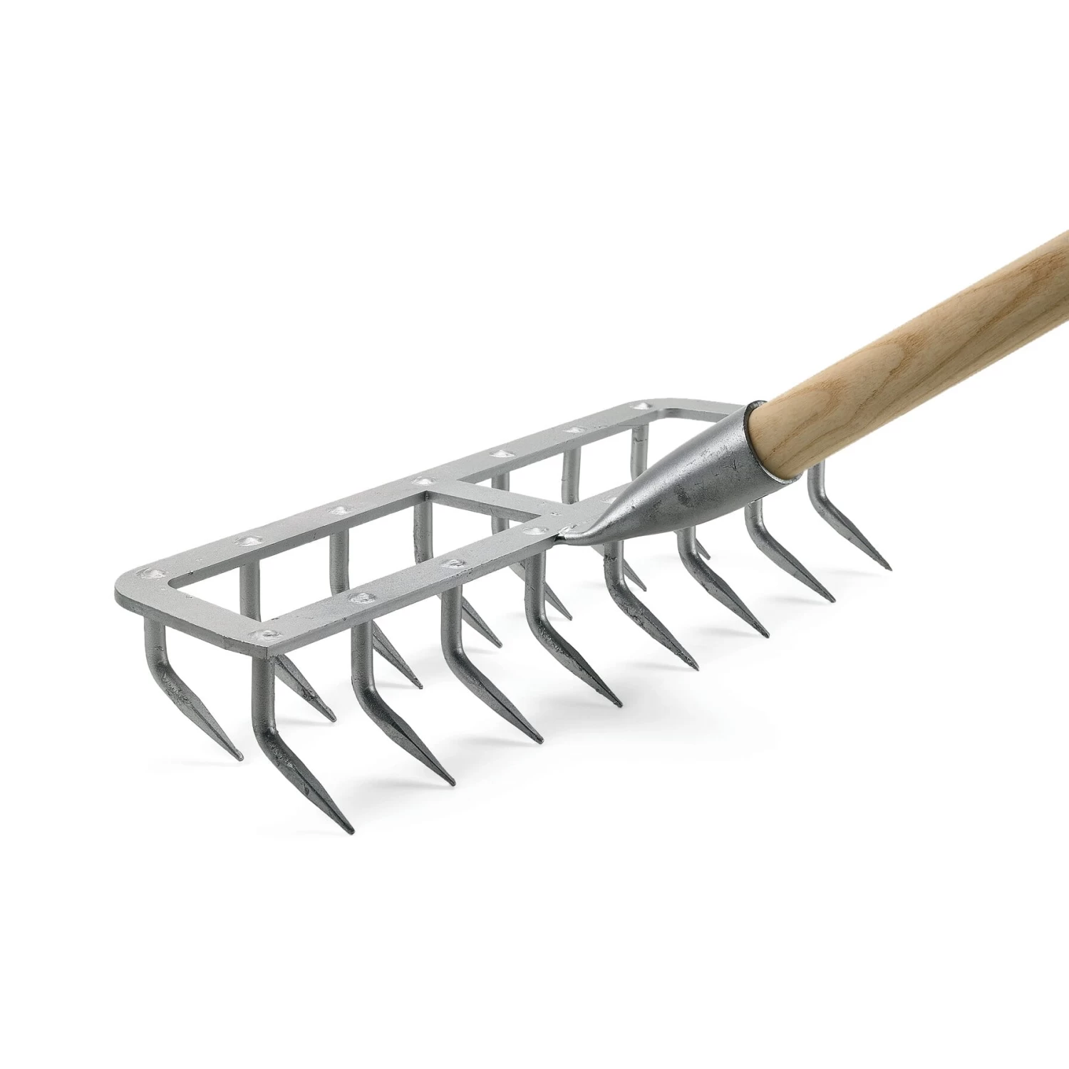 Een fantastisch werktuig voor het losmaken van de grond en onkruidbestrijding: de steel is onder een ongewone, maar nauwkeurig berekende hoek geplaatst, zodat de twee rijen tanden in de normale werkstand de grond loodrecht raken en deze verbazend grondig bewerken – eigenlijk als een eg. Het gereedschap is een speciaal ontwerp voor professionele tuiniers.