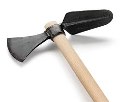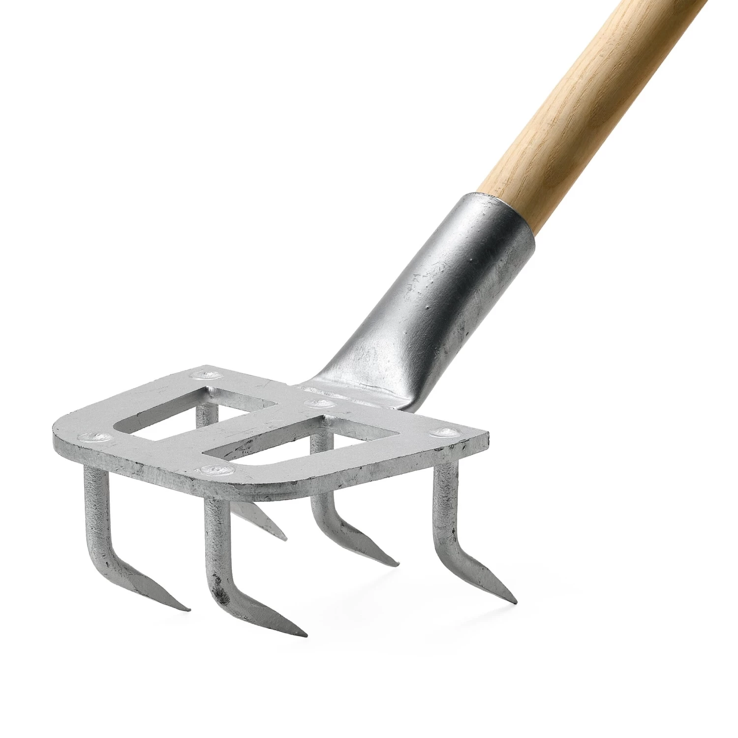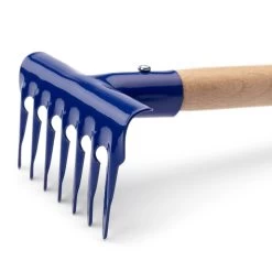 Een fantastisch werktuig voor het losmaken van de grond en onkruidbestrijding: de steel is onder een ongewone, maar nauwkeurig berekende hoek geplaatst, zodat de twee rijen tanden in de normale werkstand de grond loodrecht raken en deze verbazend grondig bewerken – eigenlijk als een eg. Het gereedschap is een speciaal ontwerp voor professionele tuiniers.