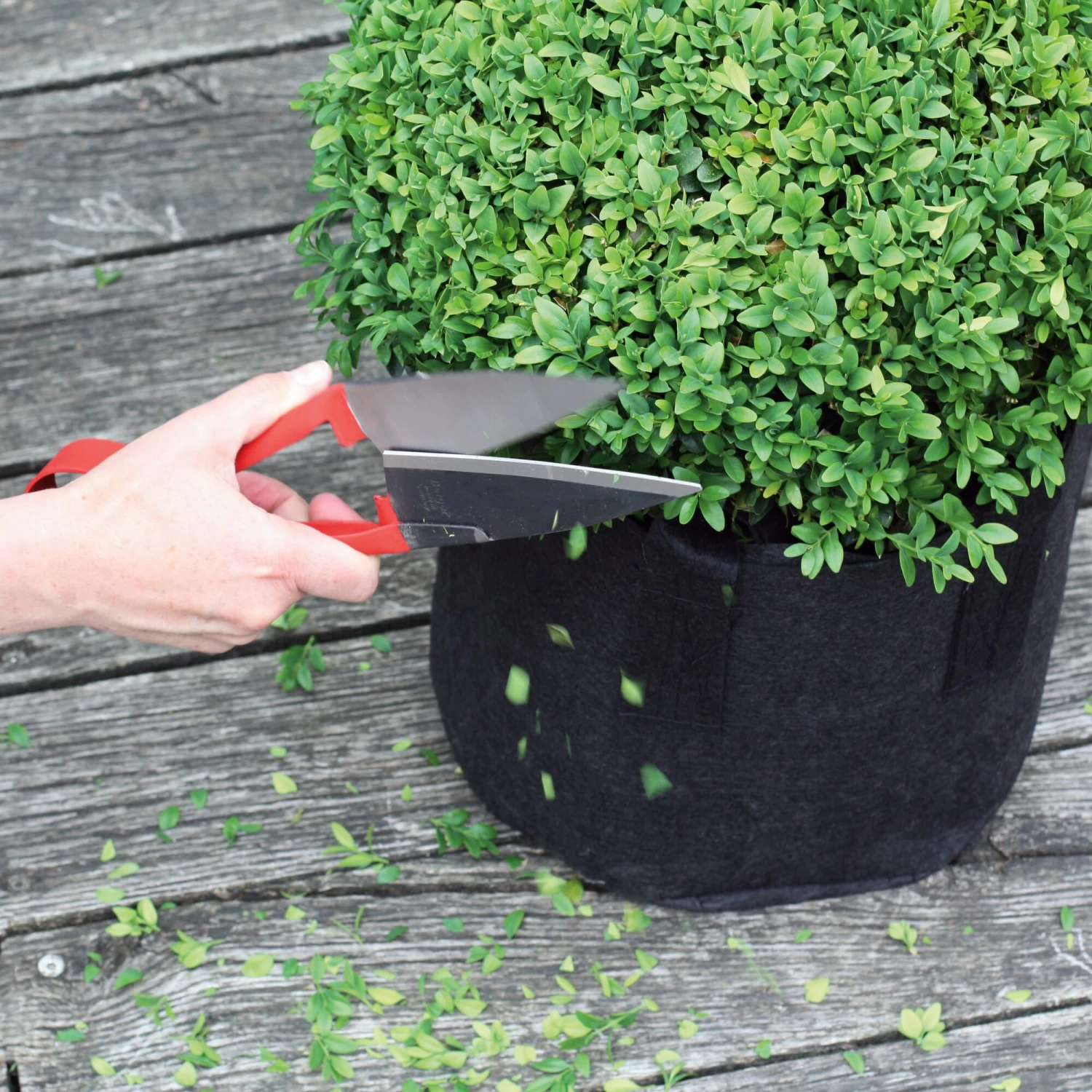 De zogenaamde gebogen bladen van deze snoeischaar, die in een bepaalde hoek ten opzichte van het hartvormige handvat zijn geplaatst, vergemakkelijken de hantering aanzienlijk. Het feit dat het schaarblad zich tijdens het gebruik in het verlengde van de onderarm bevindt, verhoogt over het algemeen het knipcomfort. Bovendien kan deze schaar bij het vormsnoeien dichter bij het groen worden geleid – het precies knippen van grote of kleine buxusbollen en andere planten is dus gemakkelijker dan met andere scharen. Dankzij de speciale zachte laklaag op het rode handvat ligt de buxusschaar ook zeer prettig in de hand.