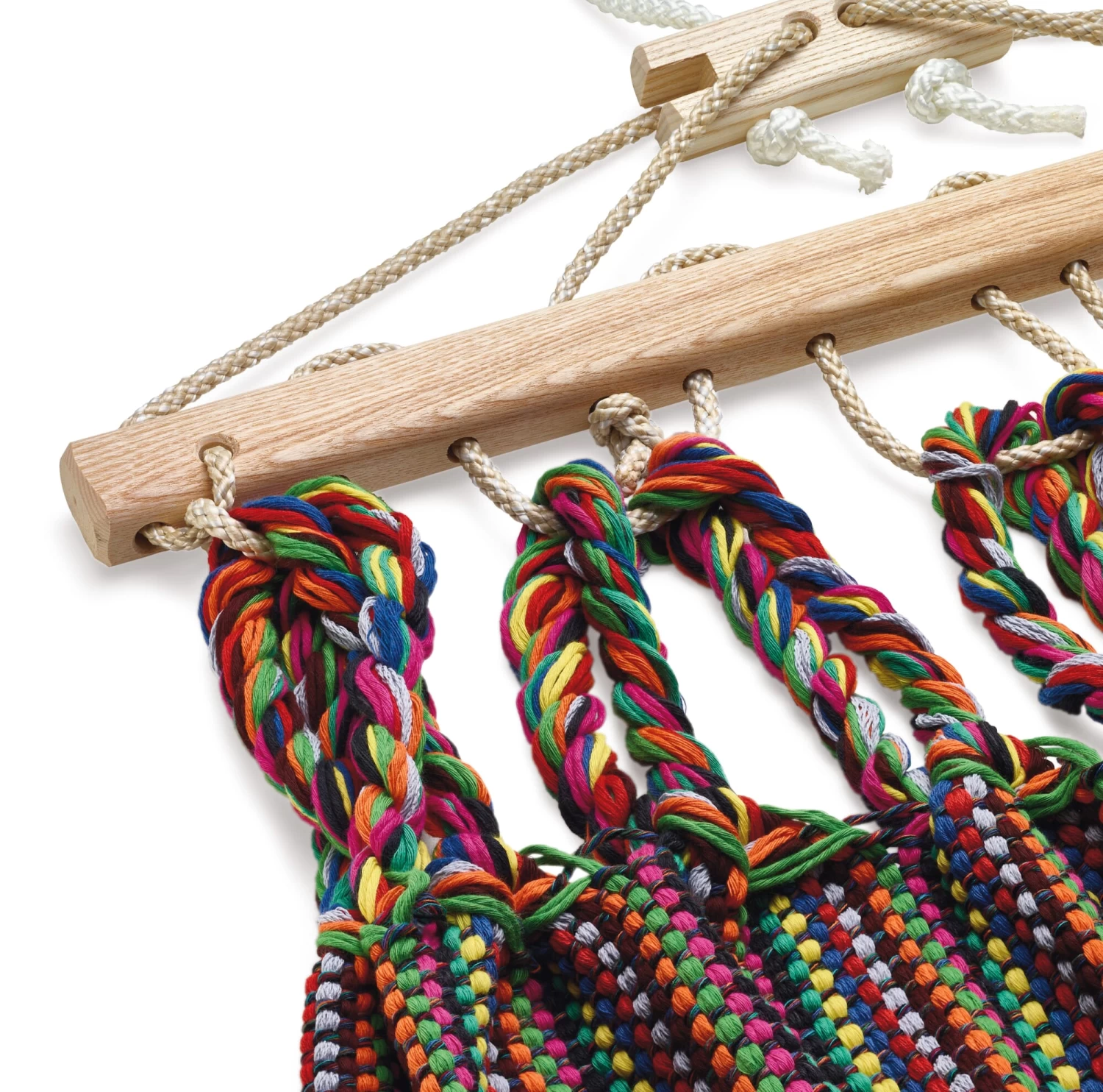 De hangmatten zijn gemaakt met behulp van een speciaal ontwikkelde eindeloze weeftechniek. Ze hebben niet alleen een materiële weelde die je voelt zodra je ze vastpakt – ze zijn ook uitzonderlijk scheurvast. Een verstelbare houten bevestigingsstang voorkomt dat de mat in elkaar schuift, en een spaninrichting maakt lengteveranderingen mogelijk. Alleen voor het ophangtouw gebruikt de fabrikant een synthetisch materiaal, een UV- en weerbestendige polyestermix, die de veerkracht van de hangmat op lange termijn garandeert.