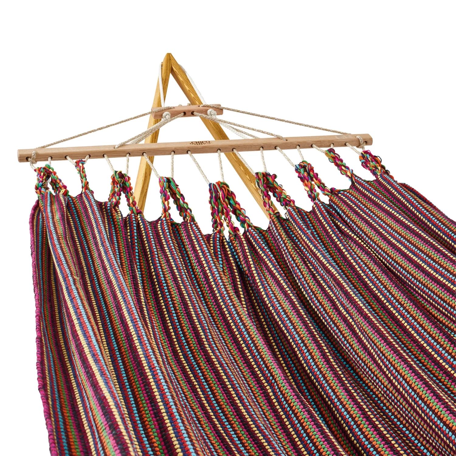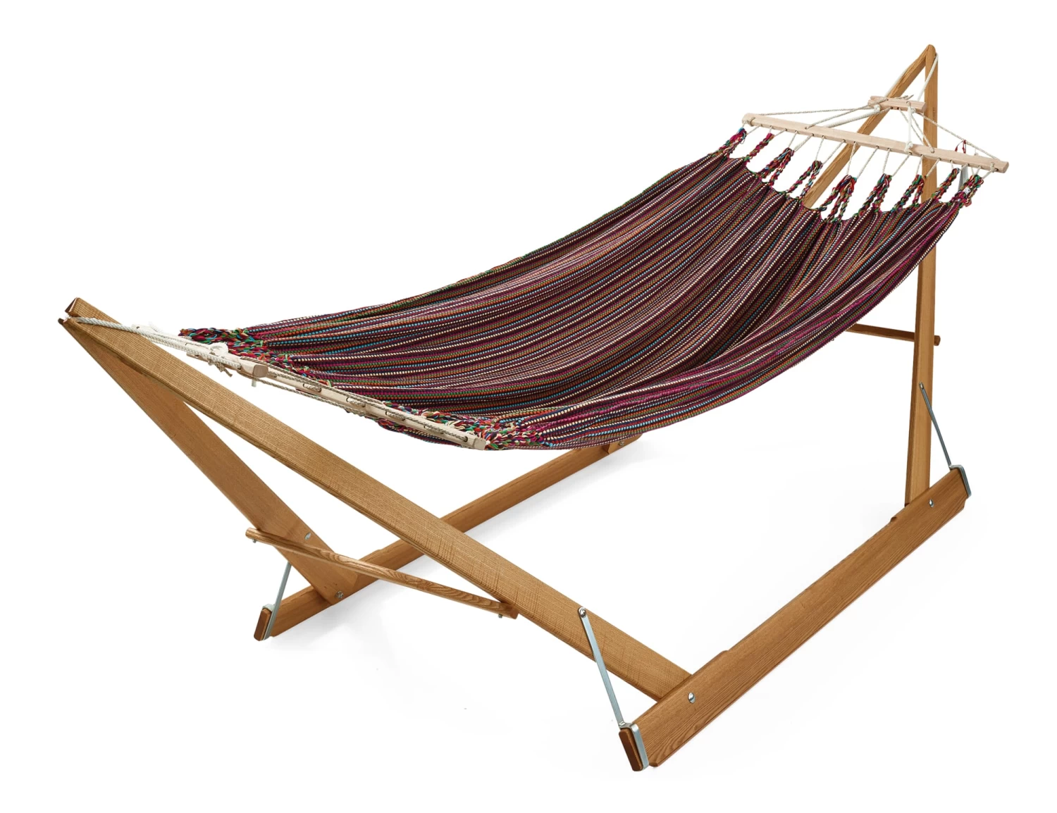 Voor twee personen, om dwars te liggen of om te zitten en comfortabel te schommelen. 100% katoen, essenhout, polyester draagtouw. Overspanning minstens 3,50 m, 210 × 190 cm. Gewicht 6,5 kg. Max. belasting 250 kg. Gemaakt in Oostenrijk. Levering zonder standaard en zonder chassis.