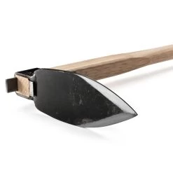 Kop met de hand gesmeed uit koolstofstaal (C45). Greep essenhout blank gelakt. Gemaakt in Duitsland. blad 11,5 x 7 cm. Vork 10 x 6,5 cm. Totale lengte 45 cm. Gewicht 630 g.