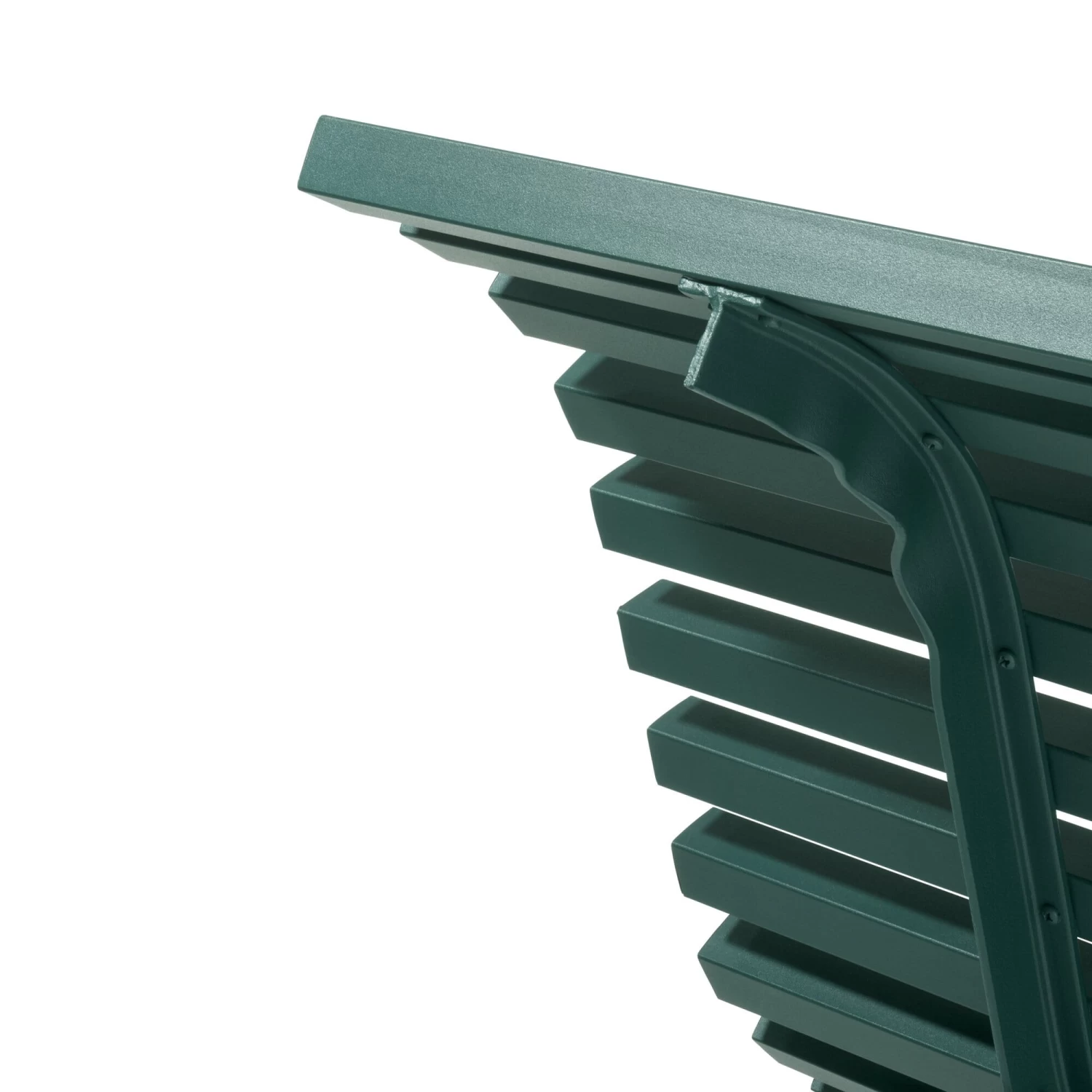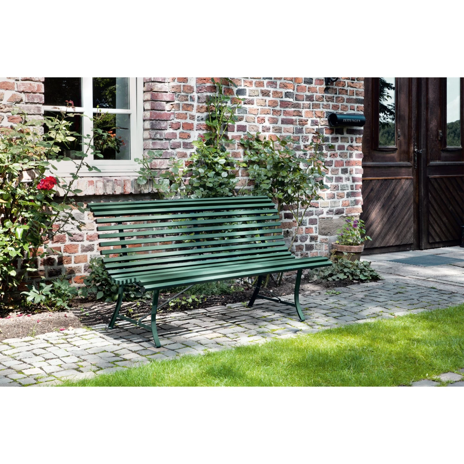Gegalvaniseerd staal, donkergroen geschilderd. Gemaakt in Frankrijk. Hoogte 81 cm, breedte 149 cm, diepte 68 cm. Zithoogte 42 cm, zitdiepte 42 cm. Gewicht 33 kg. De bank wordt gedemonteerd geleverd en kan in een paar eenvoudige stappen worden gemonteerd.