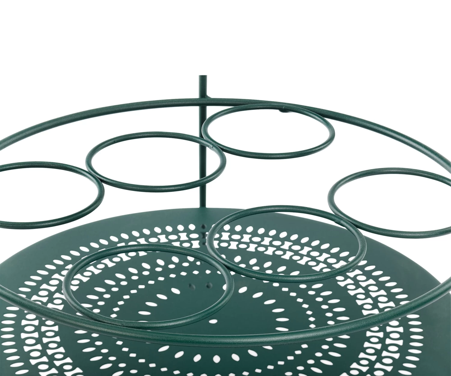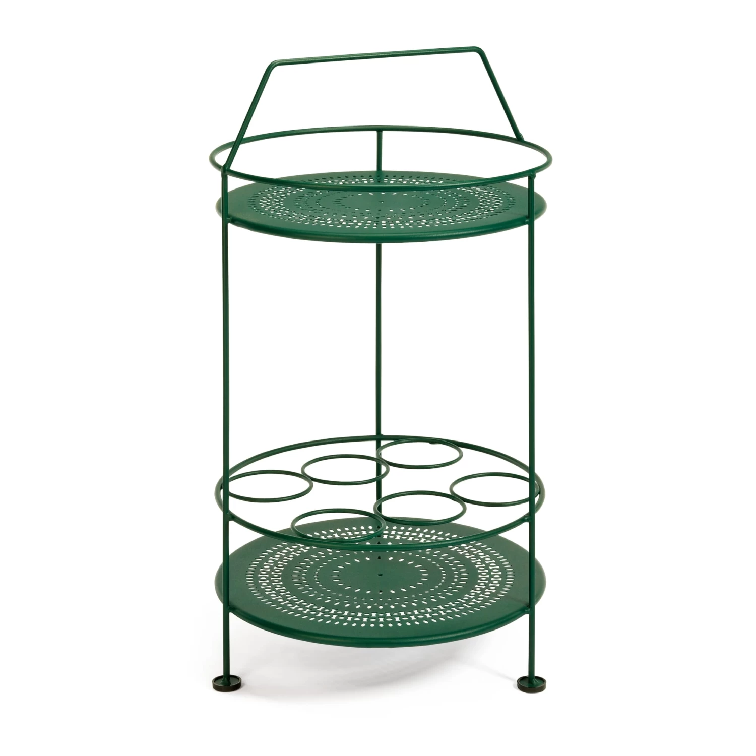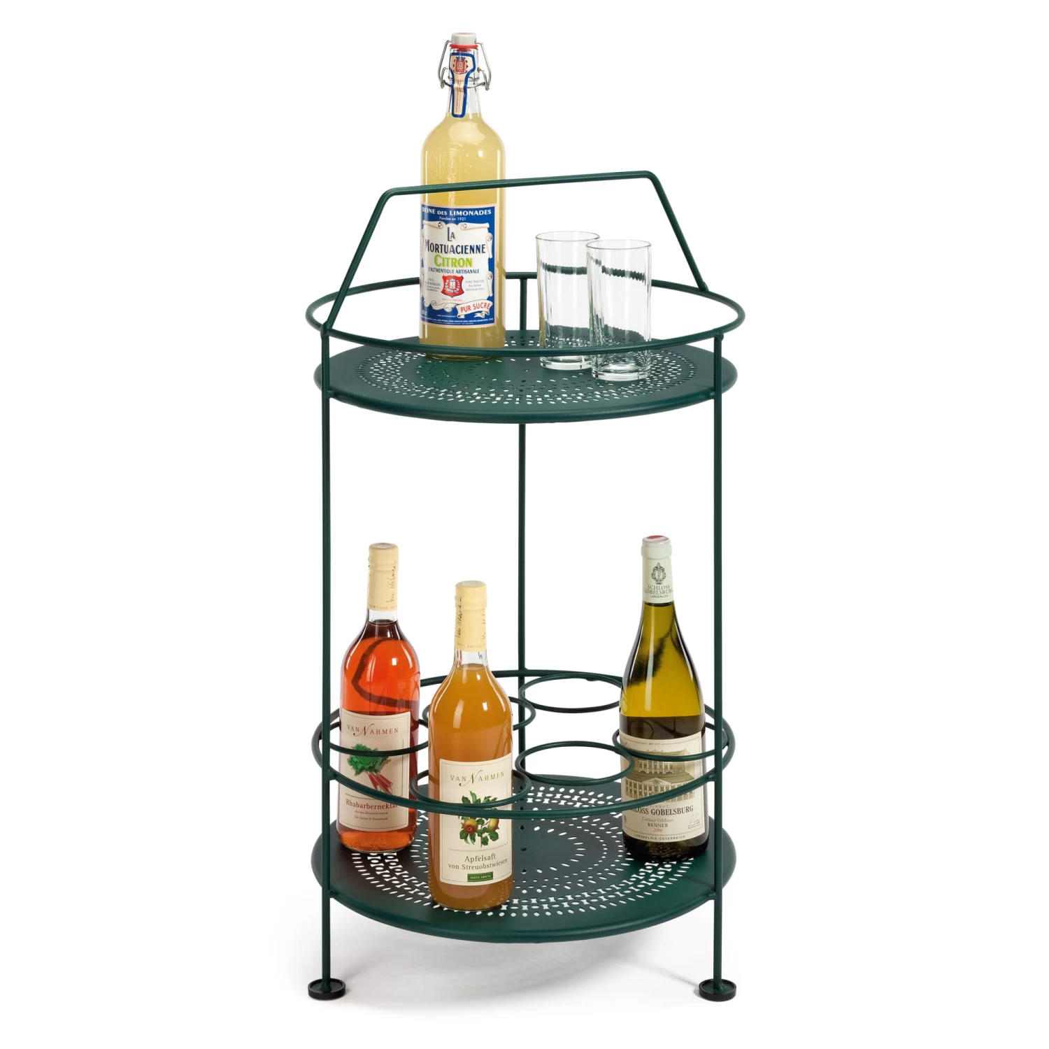Deze functionele bijzettafel biedt veel opbergruimte op twee niveaus in een kleine ruimte: tot zes flessen kunnen vanuit de keuken of de kelder naar buiten worden gedragen in het onderste gedeelte – beschermd tegen omvallen en wegglijden dankzij stabiele stalen ringen – terwijl glazen of borden kunnen worden opgeborgen op het bovenste oppervlak. In tegenstelling tot een dienblad kan de tuinbar met één hand worden gedragen, zodat de andere hand vrij blijft om bijvoorbeeld te lezen. Het gebruikte staal werd tegen corrosie beschermd met een uitgebreid kataforese-proces, aangezien een eenvoudige roestbescherming niet kon voorkomen dat zich na verloop van tijd roest zou vormen bij de lasnaden of op zwaar belaste plaatsen.