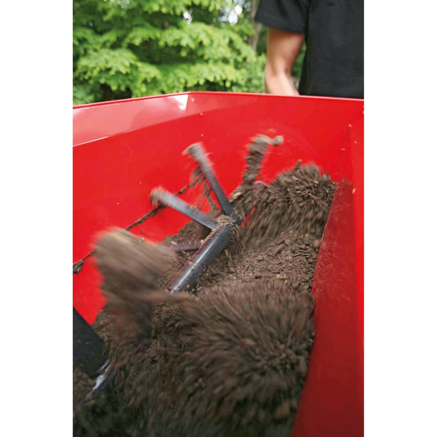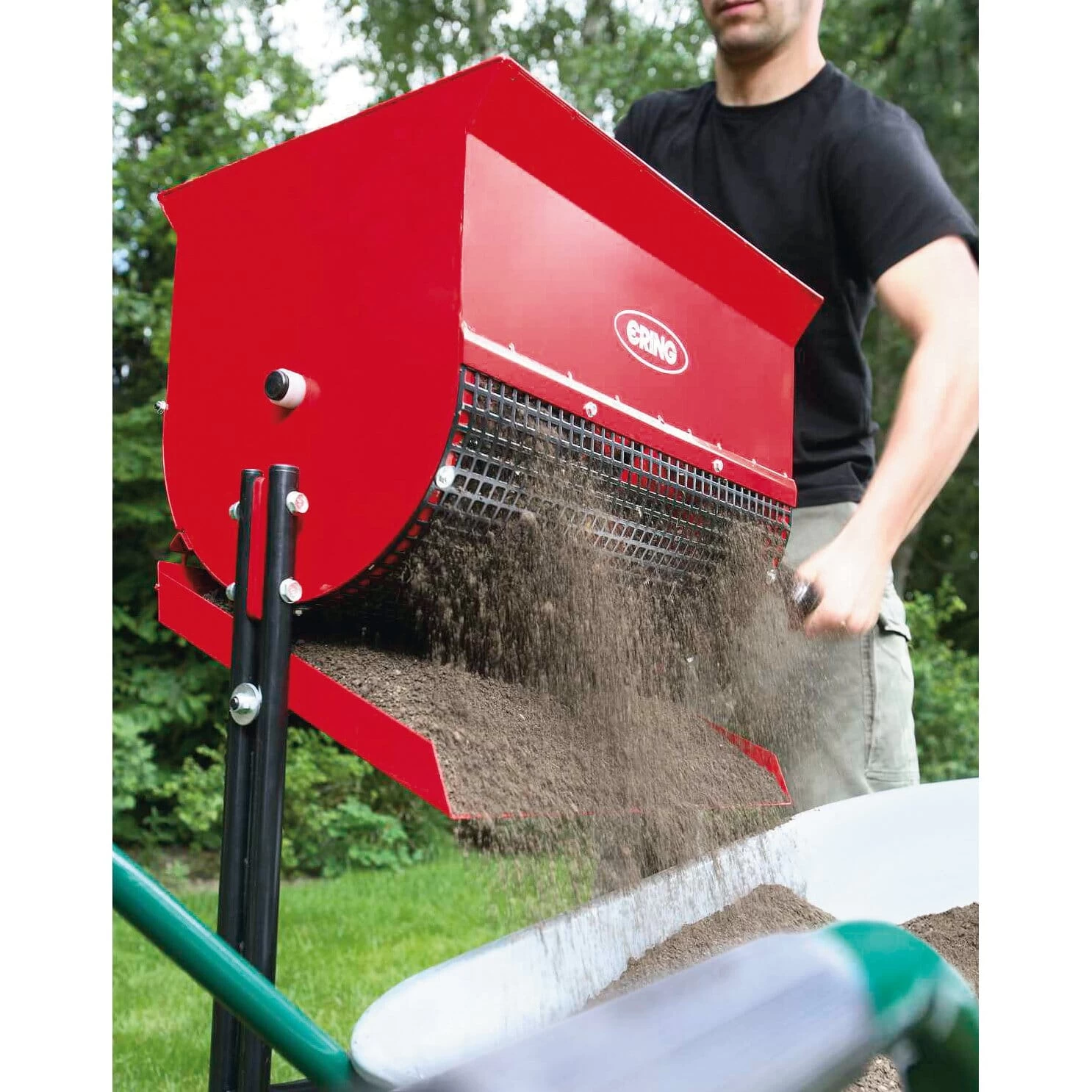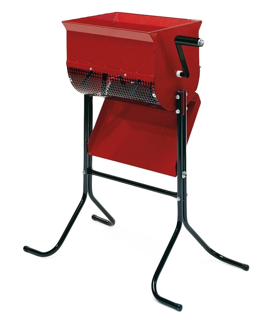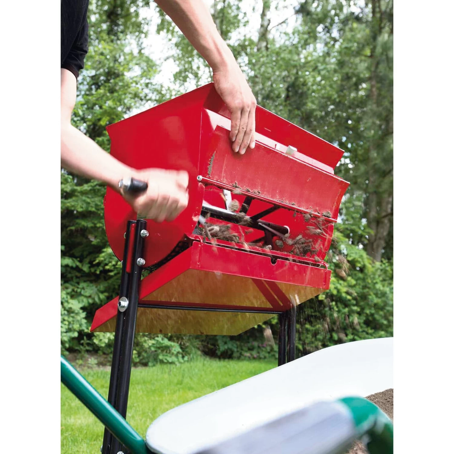 Dit met de hand bediende apparaat dient als alternatief voor de doorworpzeef. De compost wordt in de trommel gevuld, met de draaiende spindel tegen de zeef gedrukt en valt als fijne compost door de ca. 10 mm brede mazen naar beneden – bij voorkeur in een bak eronder. De niet-recycleerbare onderdelen kunnen gemakkelijk uit het toestel worden verwijderd door het achterwaarts te draaien via de geopende residuklep. De slinger kan aan de rechter- of linkerkant worden gemonteerd.