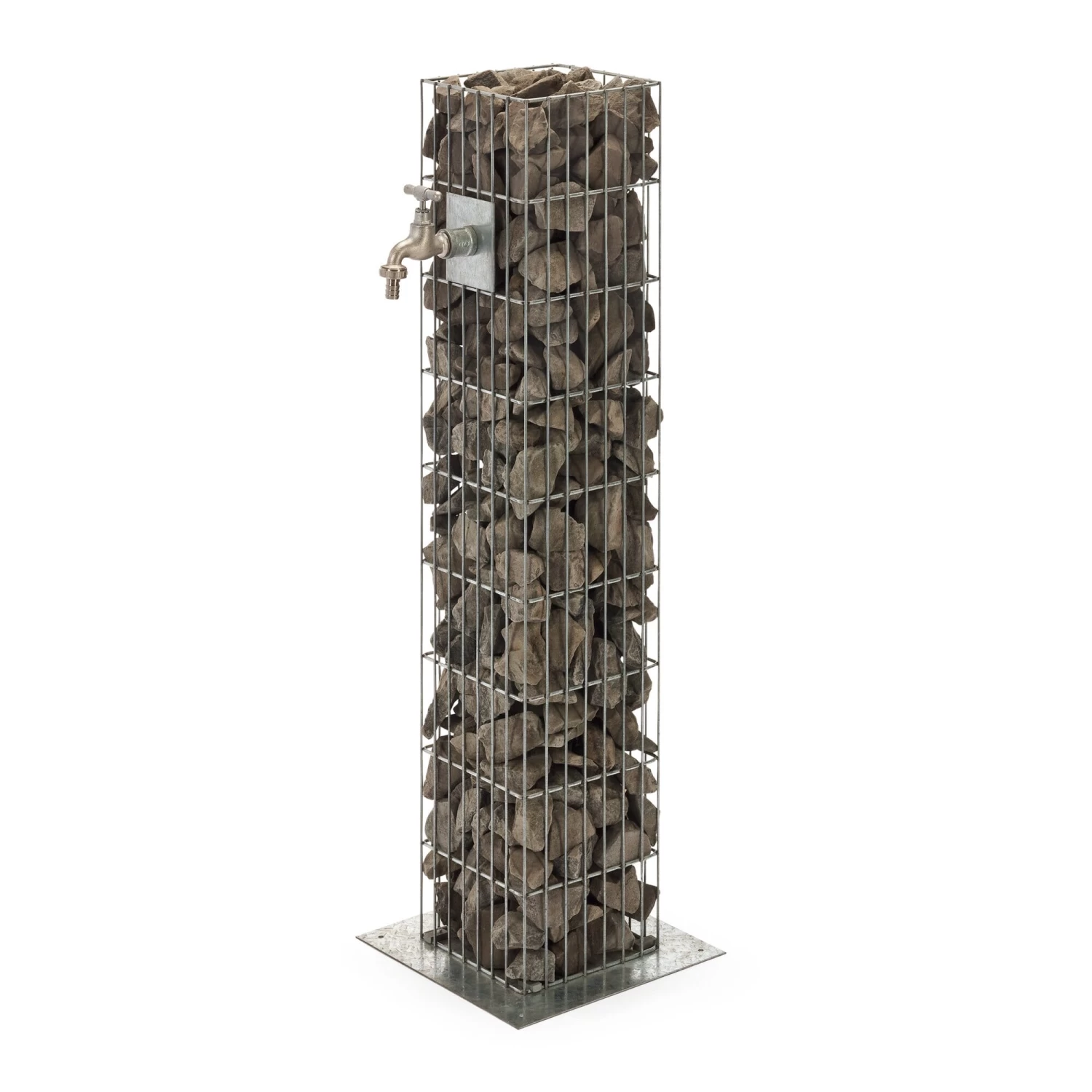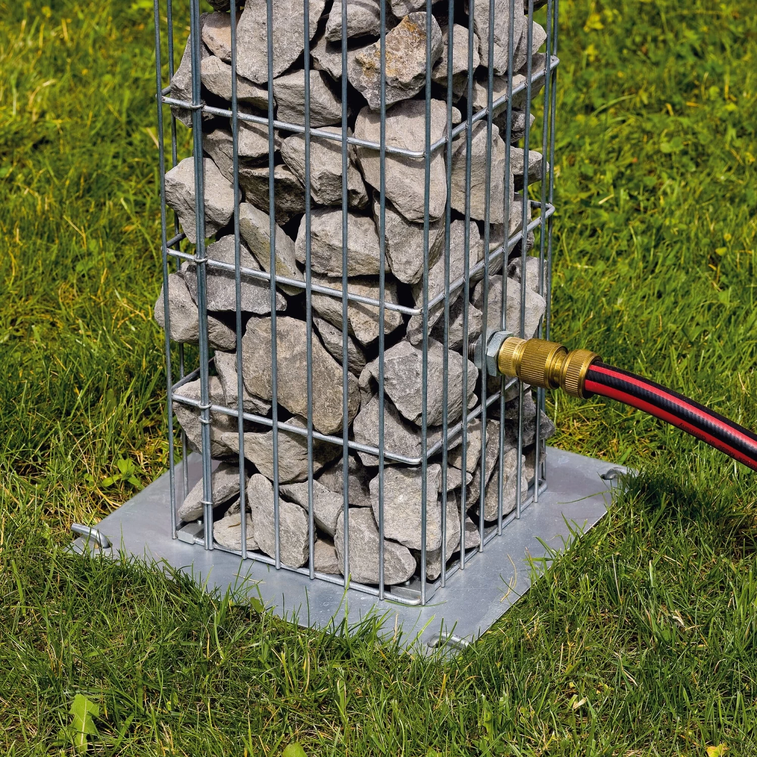 Gabion Staaldraad (staven Ø max. 4 mm) met zink-aluminium coating, thermisch verzinkte stalen bodemplaat en waterleiding, messing kraan met 3/4″ buitendraad en slangaansluitplug. Vier stalen grondankers meegeleverd. Hoogte 90,5 cm, schanskorf 19 x 19 cm, bodemplaat 28 x 28 cm. Gewicht 4,9 kg. Wij leveren de waterdispenser gemonteerd, maar zonder vulmateriaal en tuinslang. Er zijn geen grenzen aan de ontwerpmogelijkheden; wij raden natuurlijke stenen aan – eventueel in verschillende kleuren, in rijen gelegd – met een korrelgrootte van 25-60 mm, die u bij bouwmarkten kunt verkrijgen. Per kolom is ongeveer 50 kg stenen nodig.