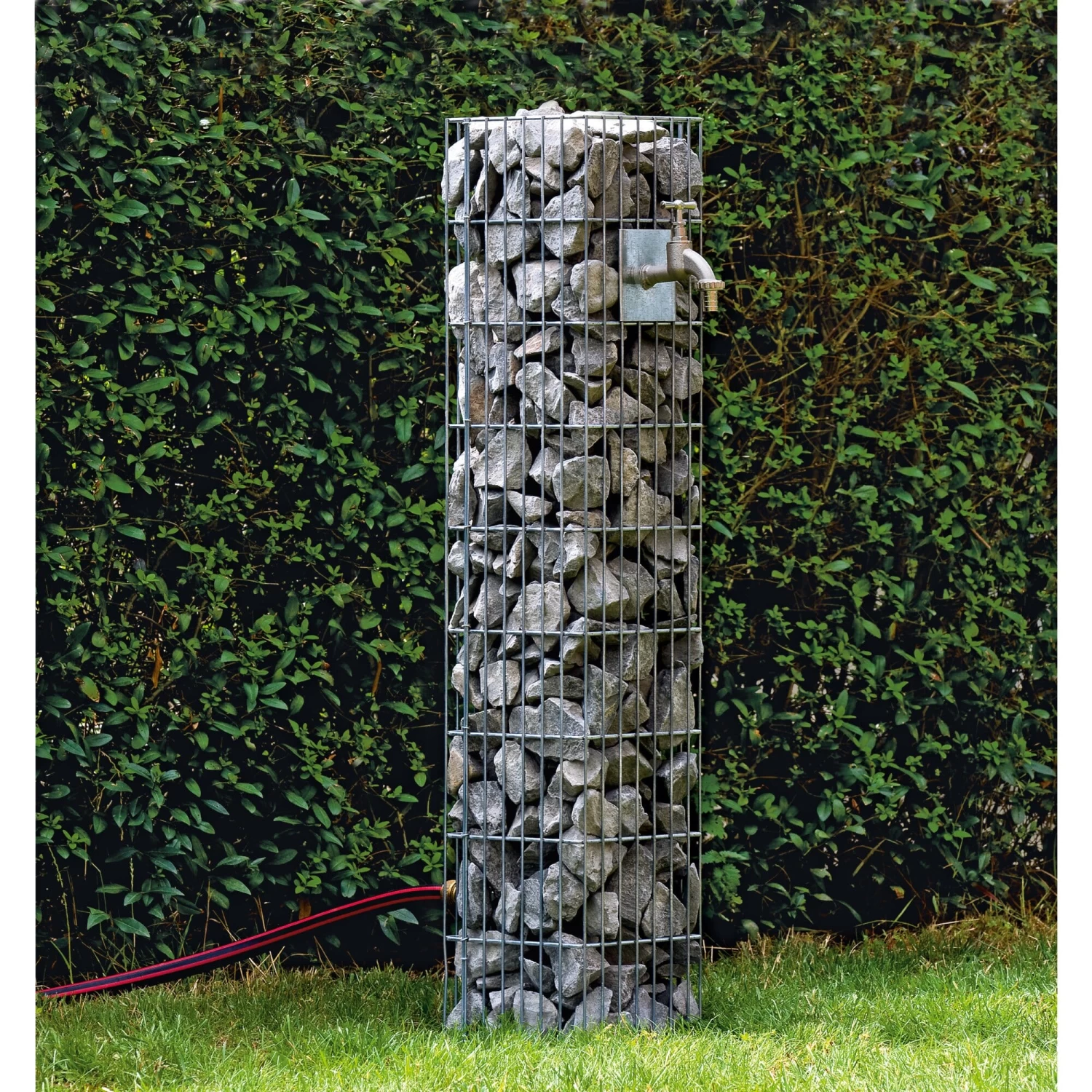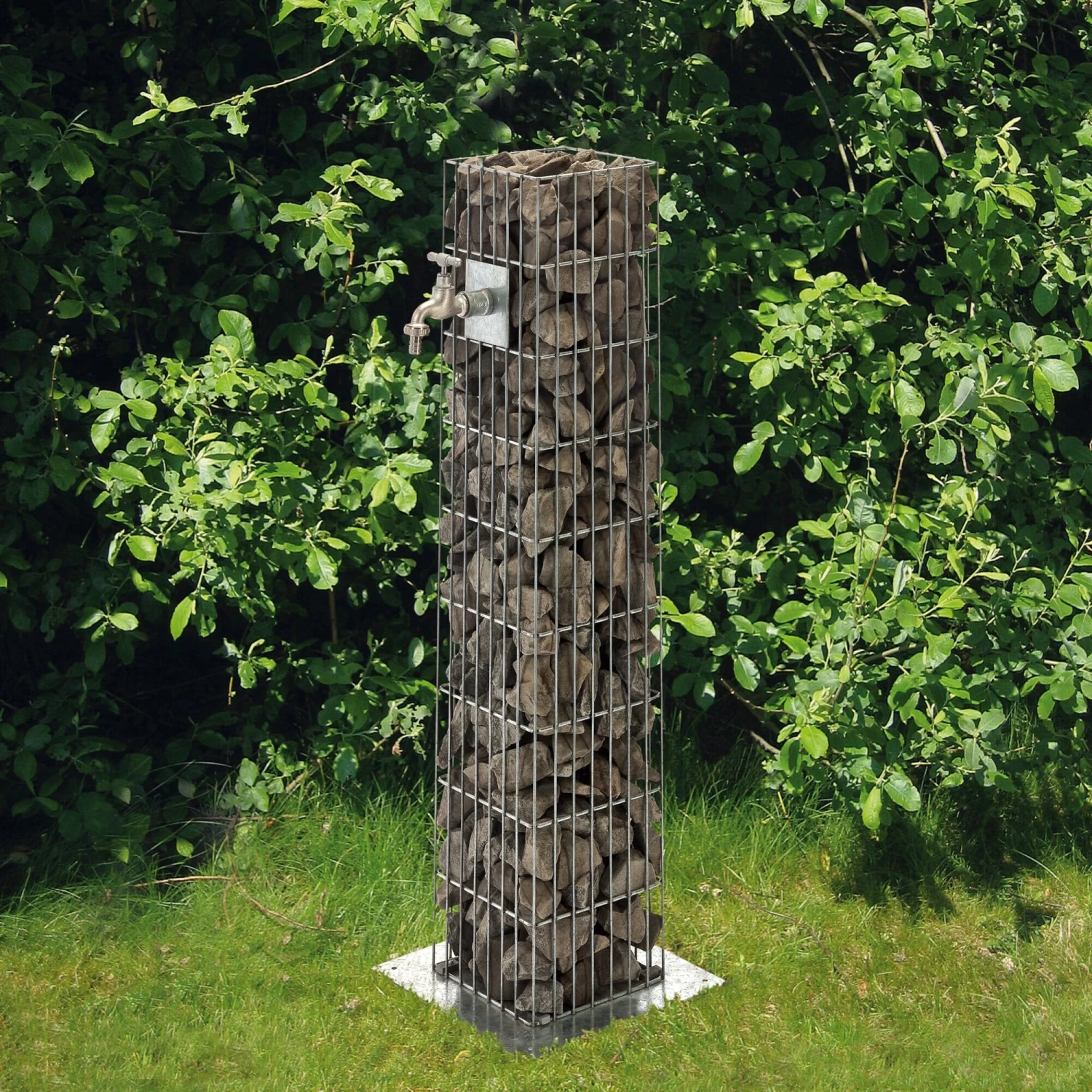 Deze slanke zuil is gemaakt van de duurzame roestwerende draad die gewoonlijk wordt gebruikt om schanskorven te maken. Het staat op een vierkante basisplaat van staal, die gemakkelijk te verankeren is: Wij leveren vier “haringen” voor bevestiging op losse grond; op vaste grond kunt u de bodemplaat gewoon vastschroeven. Een slang wordt aangesloten op de onderaan geïnstalleerde stop; de kraan voor het aftappen van water is zo geplaatst dat zelfs hoge vaten eronder kunnen worden geplaatst.