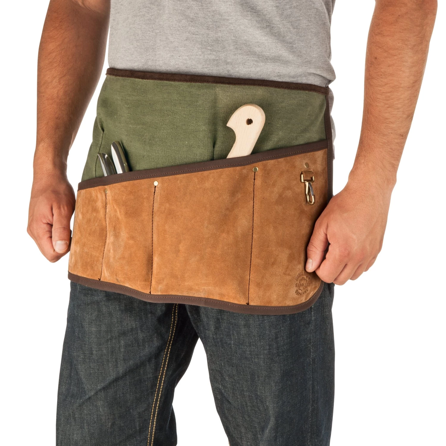 Dit schort is ook een gereedschapsriem. Het wordt om het middel gedragen en bevat vijf zakken voor klein gereedschap. Hij bevat alles wat je nodig hebt voor kleine klusjes in huis, op het erf en in de tuin – zodat je je handen vrij hebt als je je handen vol hebt.