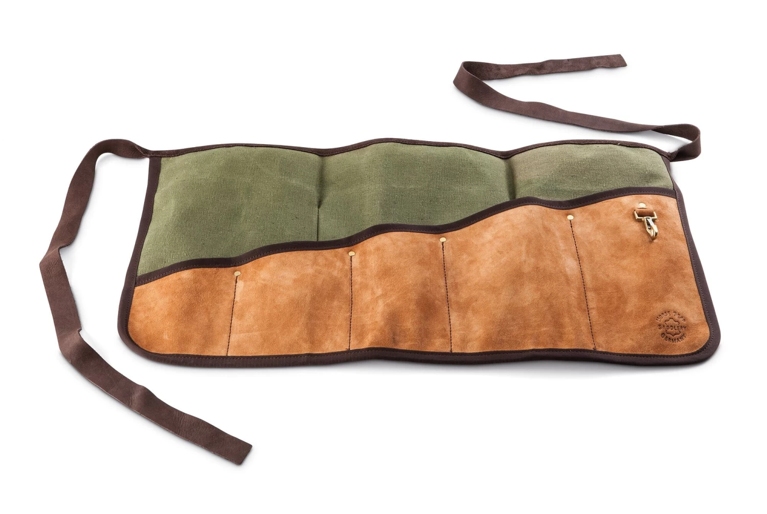 De zware koeienhuid komt uit Zuid-Duitsland en wordt daar ook gelooid. De strak geweven canvas stof is net zo robuust en, met een lichte impregnering, bestand tegen vocht. De zakken zijn versterkt met messing klinknagels. Het gereedschapschort is met de hand gemaakt in een leerverwerkend bedrijf in de buurt van Schwäbisch Hall, waar ze vooral lederwaren voor paarden en ruiters en voor boogschutters produceren.