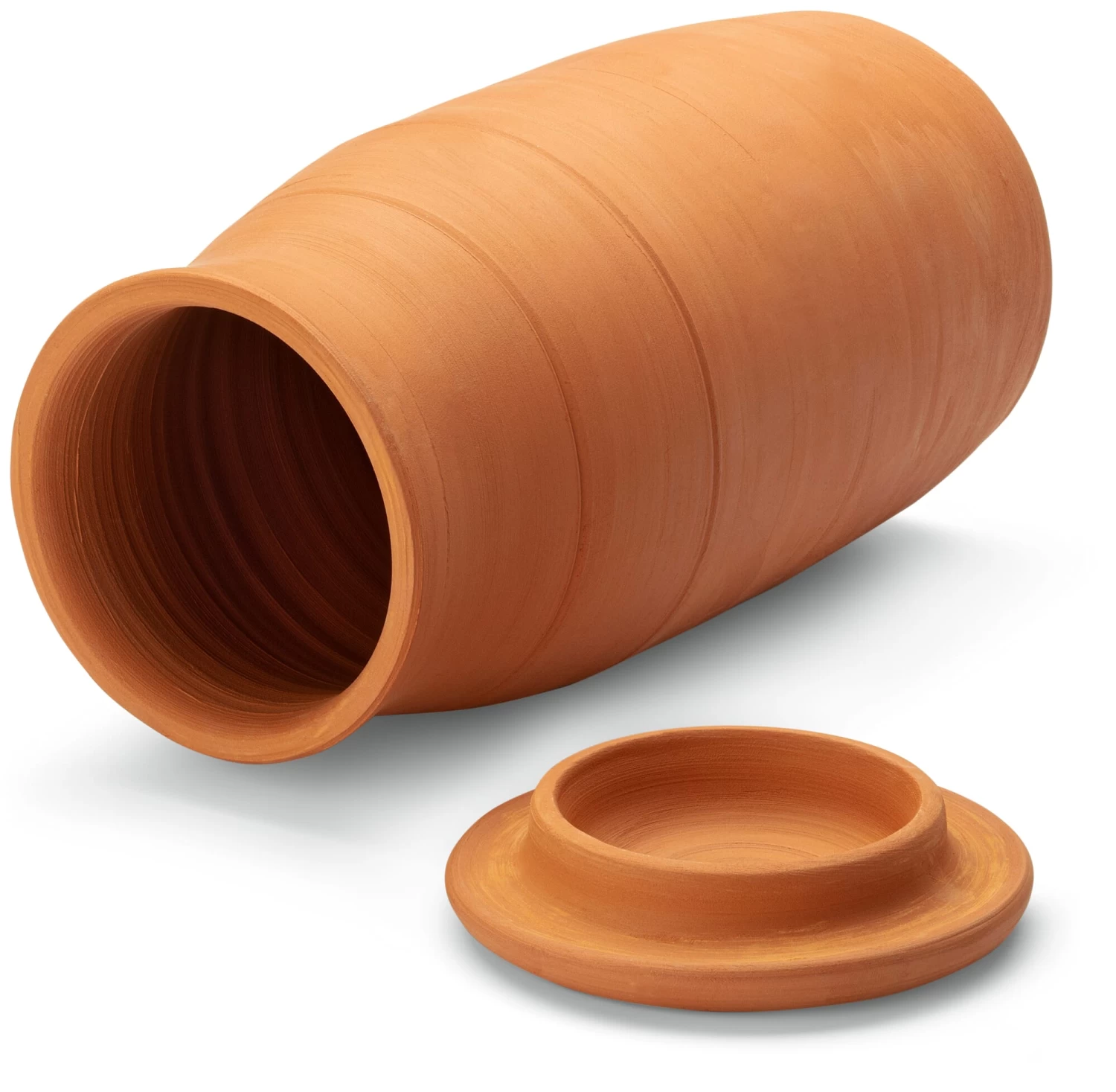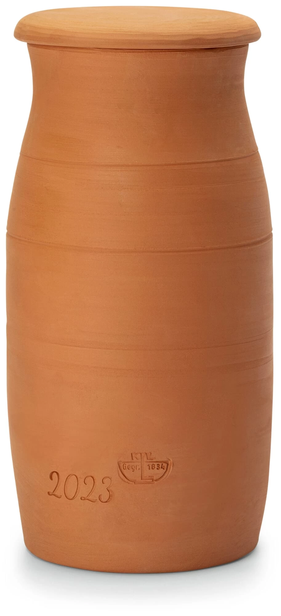 Terracotta ongeglazuurd, 2-delig. Laag gebakken en daardoor waterdoorlatend. Deel 1,2 l. Deksel Ø 9 cm, vat Ø 11 cm (gemeten in het midden). Hoogte 21 cm. Gewicht 1,2 kg. Handgemaakt op de pottenbakkersschijf. Afmetingen en vorm kunnen daarom licht afwijken. De fabrikant adviseert één pot per ca. 0,5 m² bedoppervlak. Het is daarom beter om voor grotere oppervlakken en voor planten met een hogere waterbehoefte meer dan één pot te plannen en bij de planning ook rekening te houden met de locatie van uw bedden en verhoogde bedden. Planten in de volle zon hebben meestal meer water nodig dan planten in de schaduw of gedeeltelijke schaduw. Opmerking: Berg uw gieter op voor de winter.