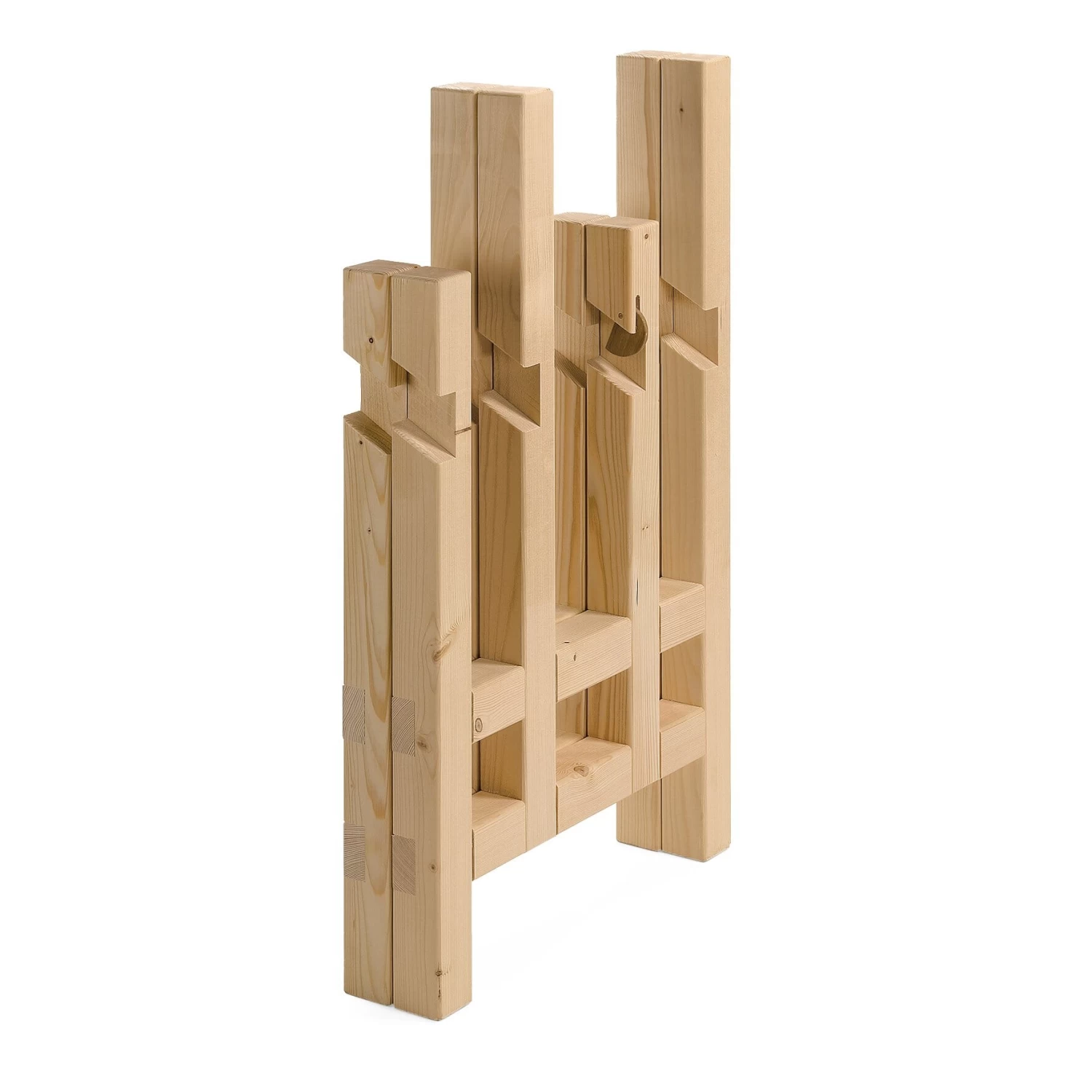 Afgerond vierkant hout van sparrenhout (herkomst Duitsland), randlengte 6 cm, vouwklink van eikenhout. Gemaakt in Duitsland. Hoogte 85,5 cm, breedte 56 cm, diepte 74,5 cm. Gewicht 12,5 kg.