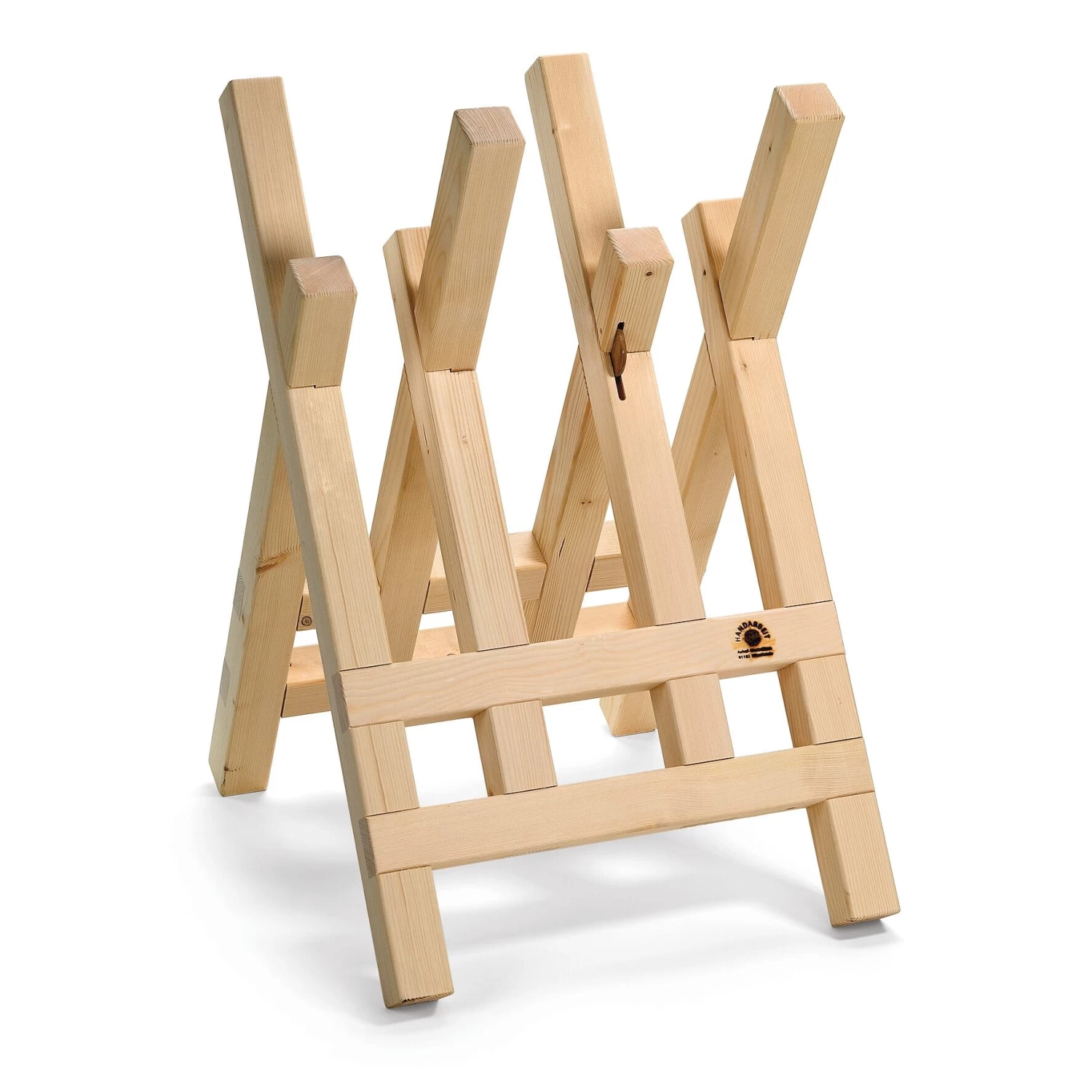 Deze stevige zaagbok is ontwikkeld voor veilig werken met de kettingzaag. Twee delen worden in elkaar geschoven en geborgd door een (geborgde) vouwsluiting. De twee uit het midden geplaatste zaagruimtes voorkomen dat de zaag vastloopt en zijn uitzonderlijk diep dankzij de ver daaronder gemonteerde dwarsbalken; omdat alle delen van de zaagbok van hout zijn, kan het kettingzaagblad nergens vast komen te zitten. De verkorte draagarmen maken het mogelijk dicht bij het werkstuk te werken en de kettingzaag veilig te geleiden op klauwaanslagen. Ook geschikt voor het trimmen van afrasteringspalen, balken, enz.