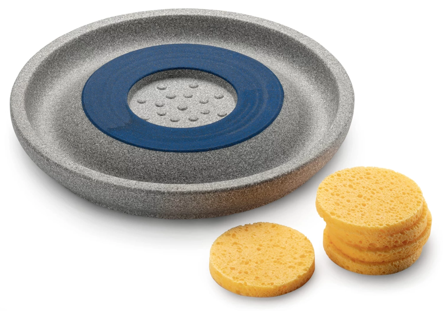 Gemaakt van Granicium® (granietkeramiek), dus vorstbestendig. Ø 26 cm, hoogte 3,5 cm. Gewicht 1,9 kg. Levering inclusief 5 sponsjes van cellulose. Schoonmaken met een zachte borstel en een beetje neutrale zeep, daarna goed afspoelen.