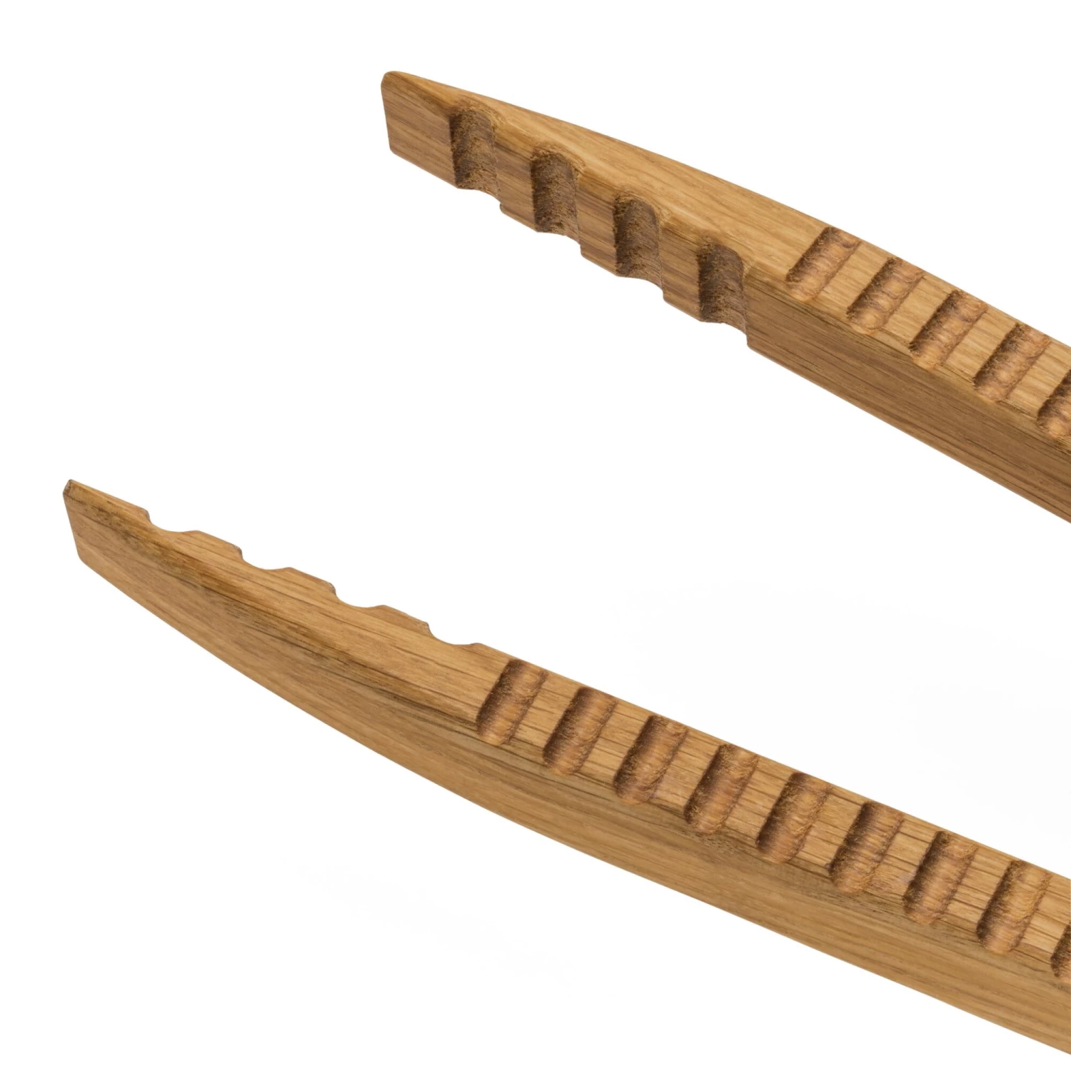 Alle worsten op de grill kunnen in één beweging worden omgedraaid. Inkepingen aan de onderkant van de twee grijpbekken maken het mogelijk door de lange tang dicht op het voedsel te drukken en eraan te duwen of te trekken. De gegrilde worstjes rollen heen en weer op de grill eronder. De fabrikant, Werkstätten Bethel in Bielefeld, gebruikt uitsluitend voor Manufactum gecertificeerd hout uit duurzame bosbouw in de omgeving van zijn bedrijf. In dit geval is het hout van Engelse eiken gedrenkt in bakolie. De houten oppervlakken zijn glad geschuurd, en verzonken handgrepen vergemakkelijken het hanteren.