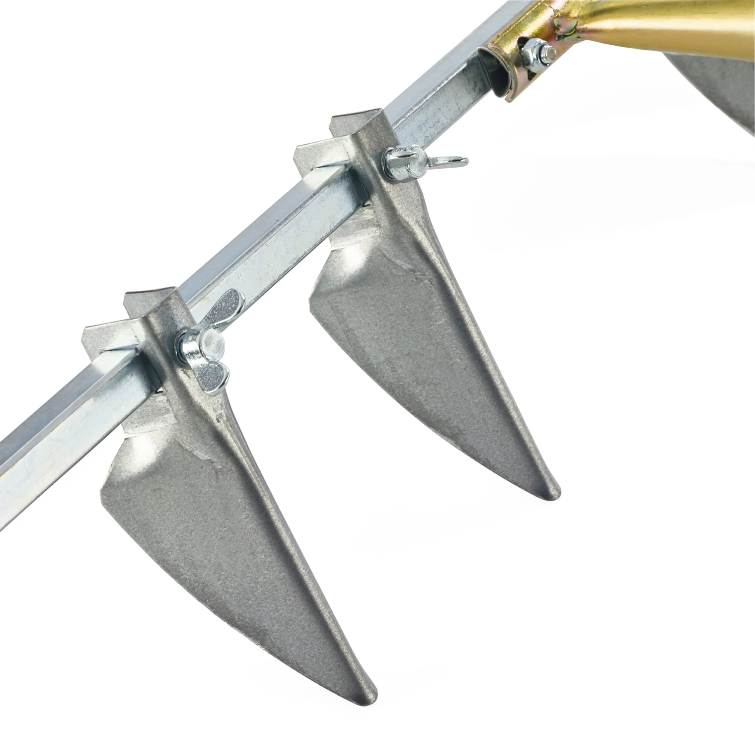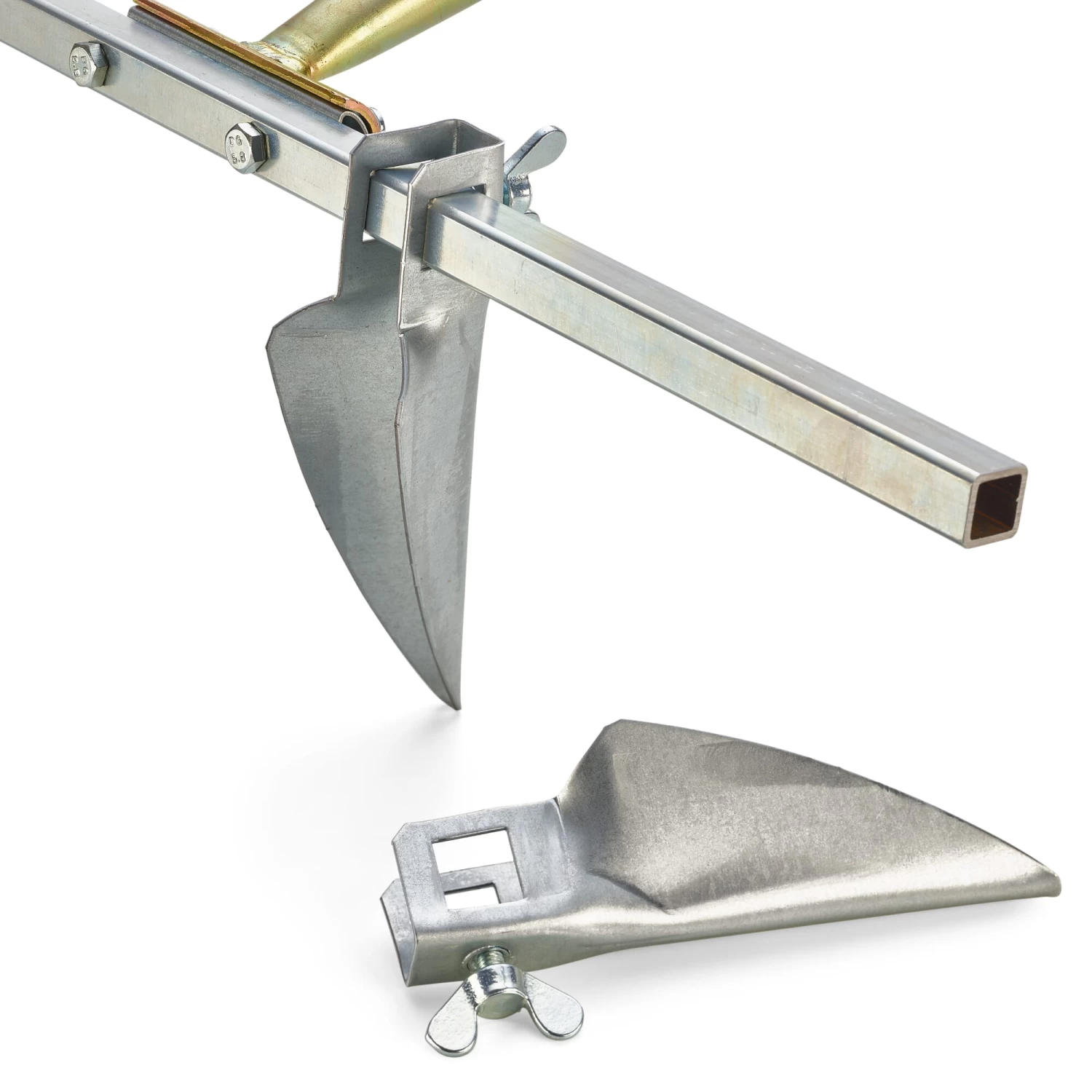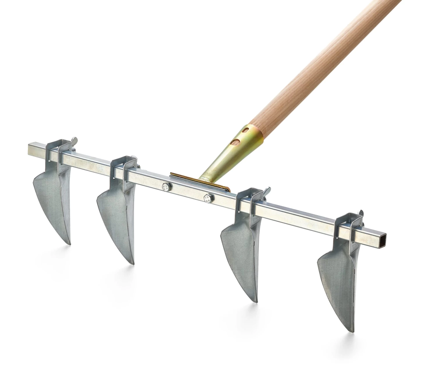 De ploegschaar is een praktisch instrument voor het zaaien in de volle grond. Het maakt het gemakkelijk om tot vier rechte en parallelle zaadrijen van uniforme diepte te trekken. Voordeel voor de eigen tuin: De kouters zijn verplaatsbaar en kunnen op elke gewenste afstand worden ingesteld of met behulp van de vleugelmoeren volledig worden verwijderd. Dit betekent dat de ploegopener nog steeds kan worden gebruikt op smalle gebieden. Hiervoor laten wij het apparaat ook speciaal voor ons vervaardigen in een smallere breedte dan voor professioneel gebruik gebruik gebruikelijk is.
