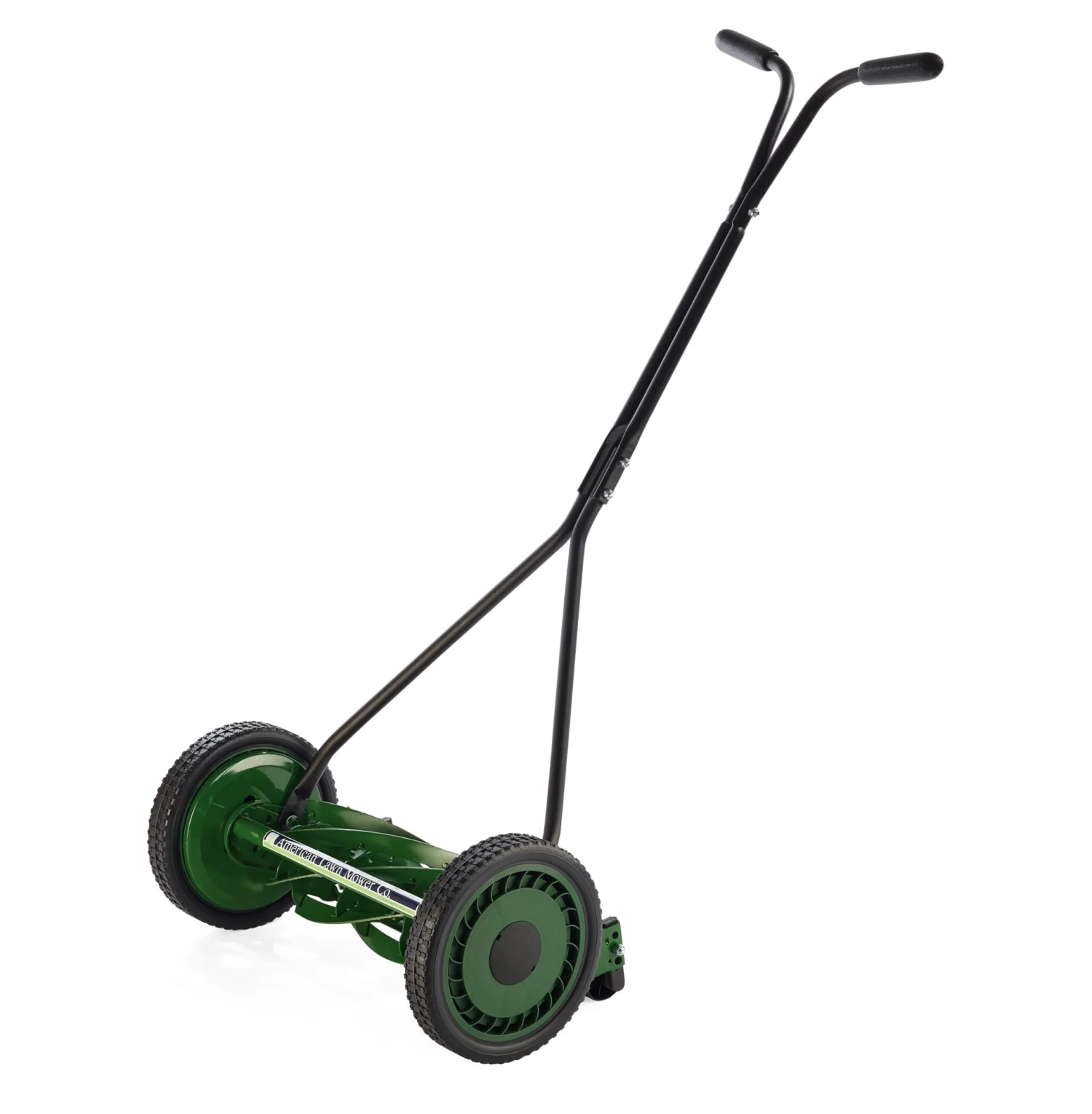 Al onze Europese voorgangers – althans de handbediende die stevig en zwaar zijn en niet hoofdzakelijk van plastic – zijn praktisch gestorven, waardoor wij gedwongen waren een echte handbediende maaier te importeren: een van de American Lawn Mower Company, die al 100 jaar grasmaaiers bouwt. Met ongeveer 10 kg is de maaier zeker geen lichtgewicht, maar hij doet zijn werk op verschillende soorten gazons en is zelfs geschikt voor weilanden; hij maait precies, soepel en stil – dankzij uitstekende technologie en afwerking: zeven geharde, scherpe messen op een met kogellagers gemonteerde spindel maaien een zwad van 38 cm. De maaihoogte kan in twee stappen worden ingesteld via de rol of in drie stappen van 13 tot 56 mm via de wielen met kogellagers en rubberbanden. Het onderste mes, dat ook gehard is, kan nauwkeurig worden afgesteld voor een gladde snede (de snede van elk mes wordt in de fabriek afgesteld tot op 1/1000″). De speciale spindel van gehard staal zorgt voor een soepele en nauwkeurige rotatie.