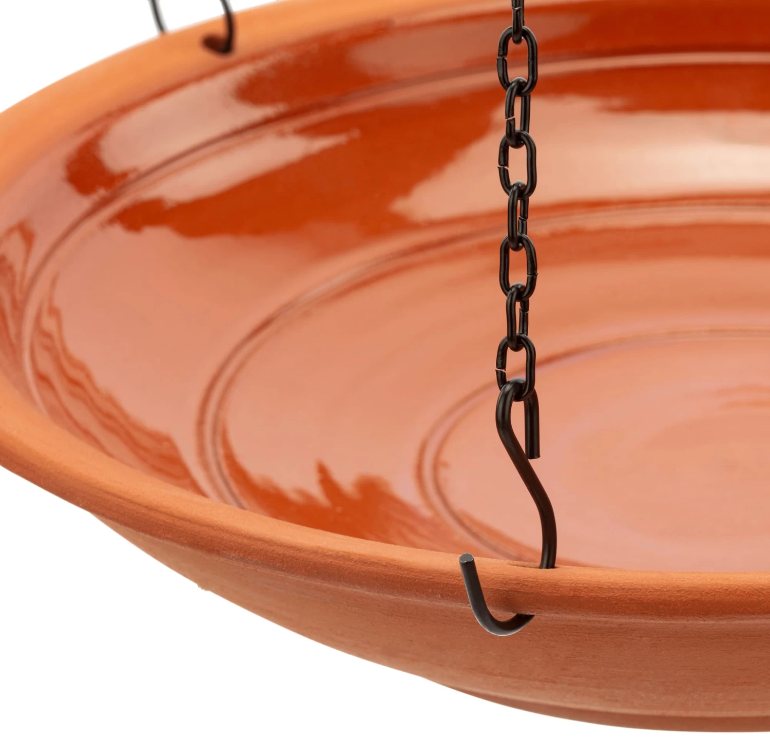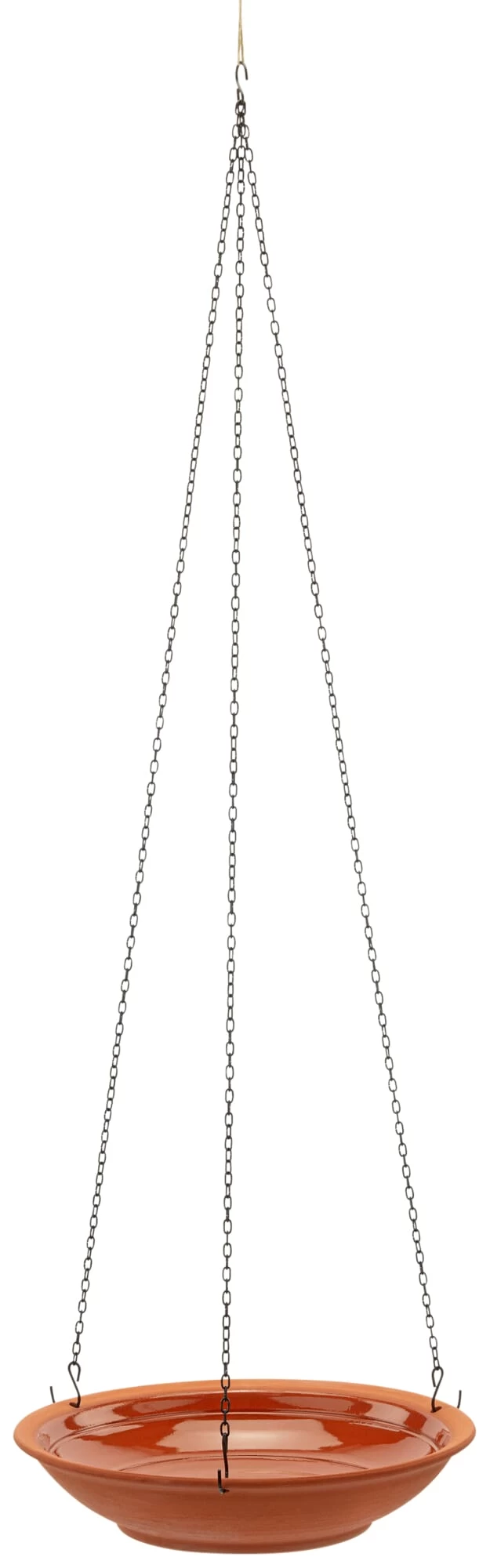 Schaal van vorstbestendige keramiek, binnenin gedeeltelijk geglazuurd, Ø 27 cm. Geschilderde stalen kettingen, lengte 64 cm. Gewicht 1,3 kg. Levering zonder bevestigingsmateriaal.
