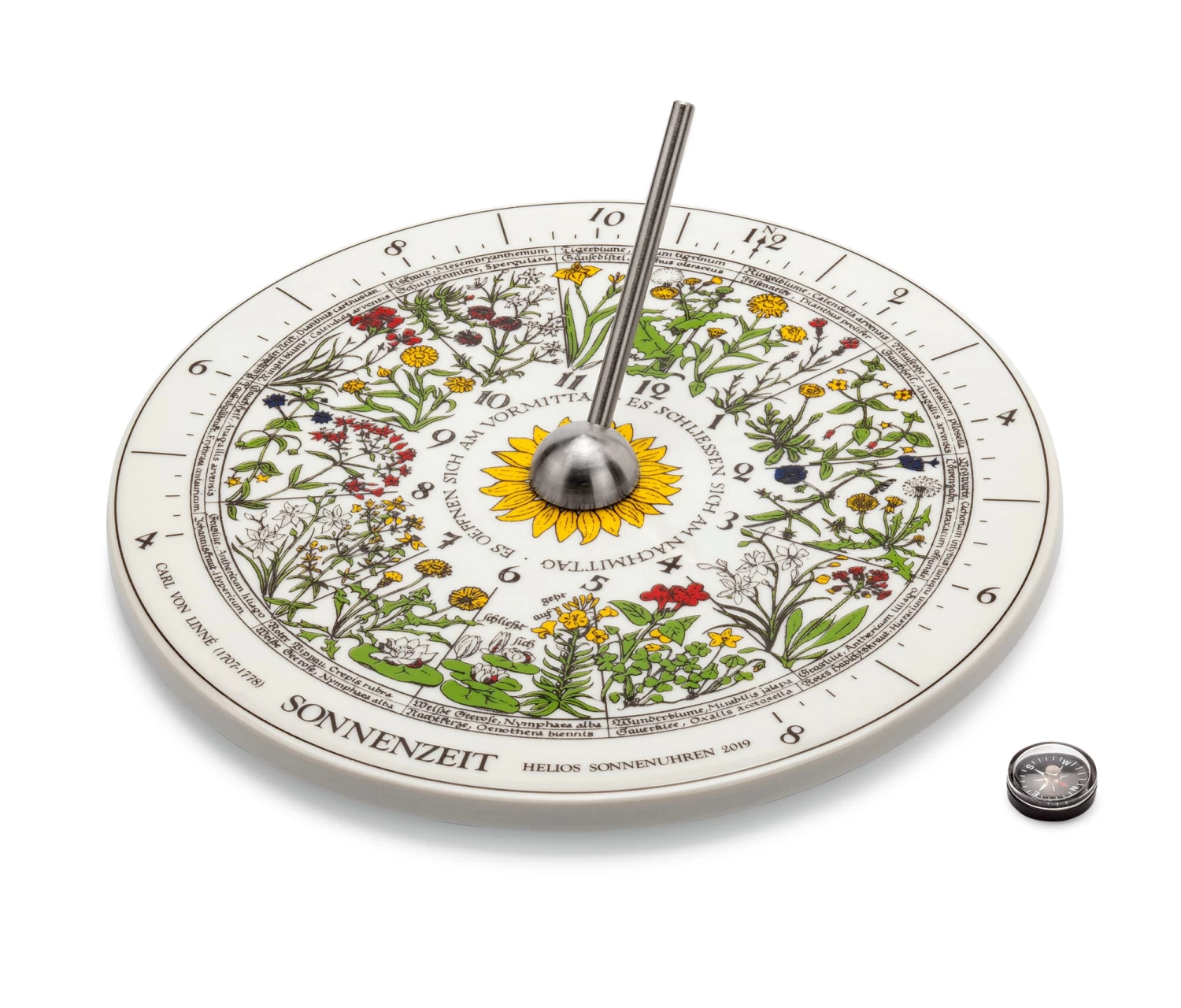 Bloemen volgen de hartslag van de natuur – en toch hun eigen tijd. Kijk wat beter naar de bloemen in uw tuin en u zult het merken: Hun bloemen openen en sluiten regelmatig op hetzelfde moment van de dag. Goudsbloemen of daglelies, bijvoorbeeld, kunnen aangeven hoe ver de ochtend is gevorderd. Op de middag vouwt de ene zijn ver bloeiende bloemblaadjes op, terwijl de andere alleen zijn kelken opent voor de zon. De beroemde Zweedse natuuronderzoeker Carl von Linné was de eerste die dit verschijnsel van dichtbij bekeek. In 1745 liet hij een bloemenklok installeren in de botanische tuin van Uppsala in Zweden, en tot op de dag van vandaag wordt gezegd dat hij met behulp daarvan de tijd altijd tot op vijf minuten nauwkeurig kon aangeven. Ook onze zonnewijzer met historisch bloemmotief geeft de tijd met dezelfde precisie aan. Zo wordt de ene natuurlijke klok prachtig gecombineerd met de andere: de klokplaat is handgemaakt van wit porselein, de veelkleurige decoratie wordt aangebracht door zeefdruk en later in de oven bij 800 °C in het glazuur gebakken. Het centrale element van elke zonnewijzer is de schaduwprojector, die in dit geval geheel van roestvrij staal is gemaakt.
