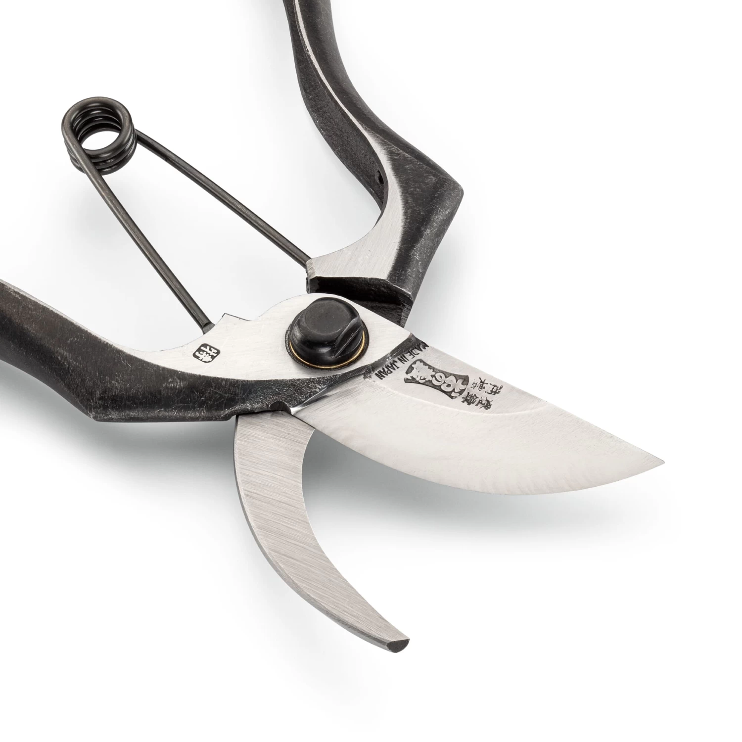 Wat voor Japanse messen geldt, geldt ook voor Japanse scharen: ze zijn extreem scherp omdat ze van koolstofstaal zijn gemaakt. Deze is ook handgemaakt – zoals u gemakkelijk kunt zien aan de gestempelde letters – van het smeden tot het slijpen en polijsten tot de uiteindelijke assemblage (maar het staat er niet zo gedetailleerd op). Eenvoudig en gevormd naar de anatomie van de hand, gemaakt van massief metaal en voorzien van een sterke torsieveer, is de schaar met zijn geharde bladen geschikt voor het knippen van struiken, rozen en houtachtige planten (tot 2,5 cm takdiameter).