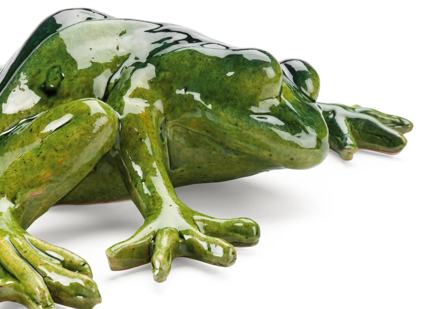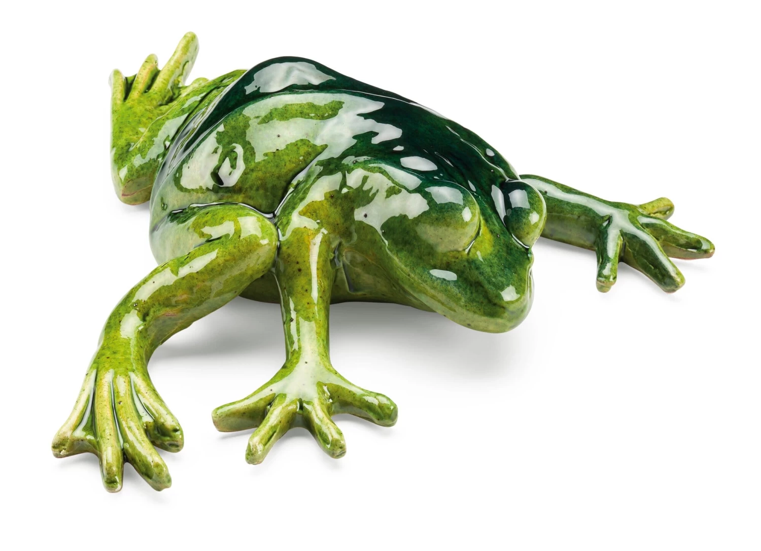 We raden ten zeerste af om deze kikker op de muur te gooien: De kans dat een knappe prins zich verstopt in het geglazuurde keramiek neigt naar nul. In ieder geval is dit – de ontbrekende kroon verraadt het – duidelijk geen exemplaar van de kikkerkoningen die op veel plaatsen regeren, maar een volkomen nuchter dier in een opmerkelijk informele, levensechte houding.