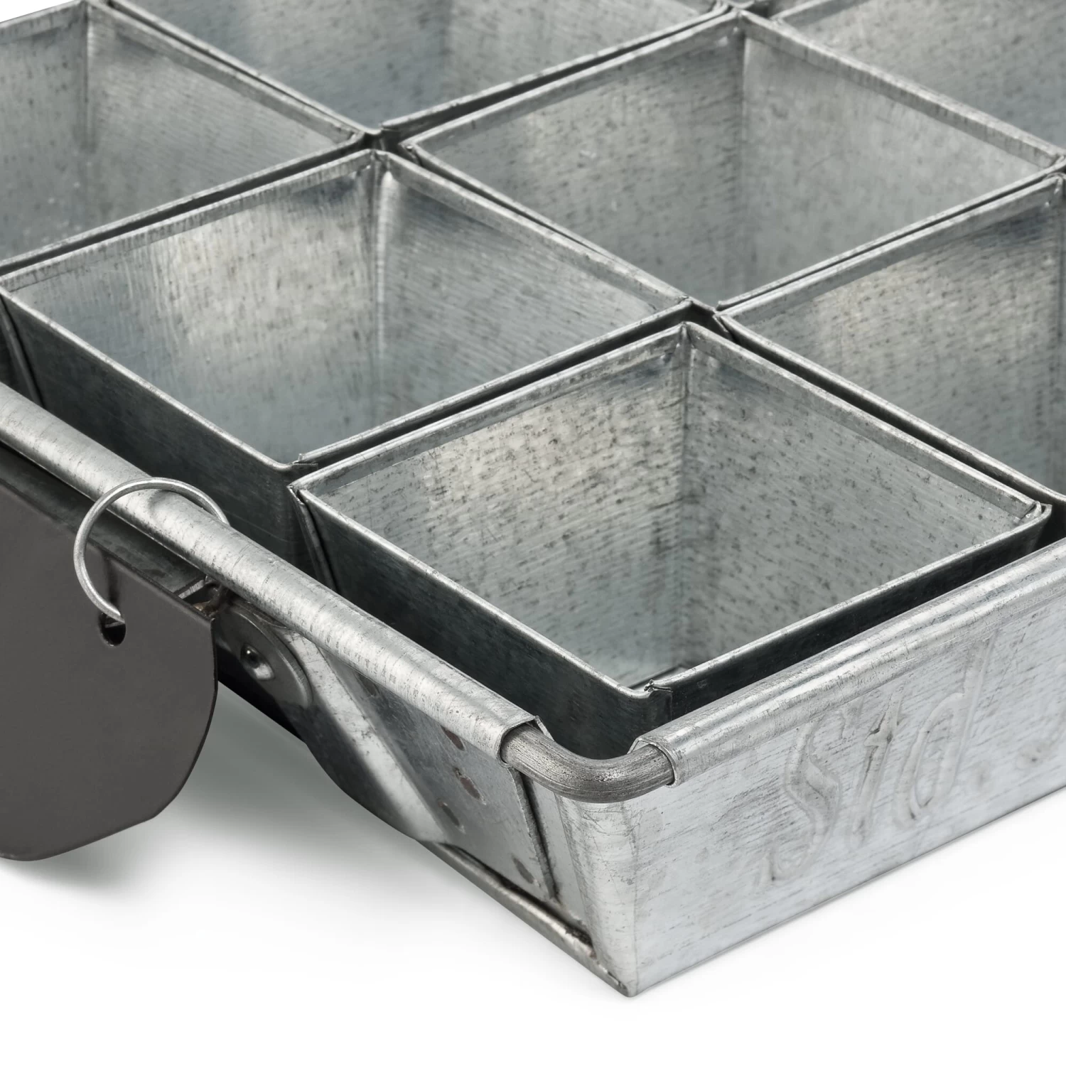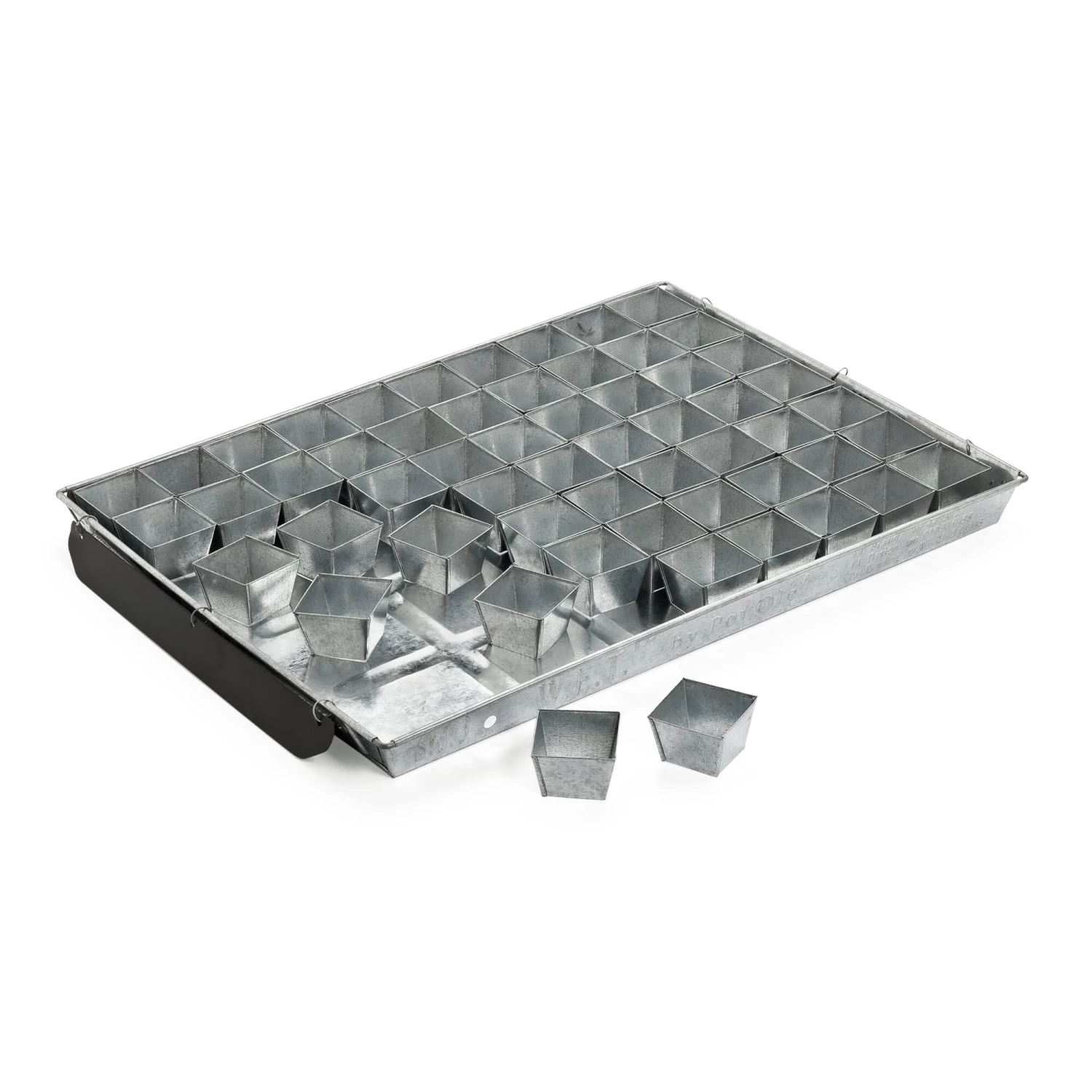 thermisch verzinkt plaatstaal. Individuele potten hoogte 3,5 cm, randlengte 5,5 cm. Verkrijgbaar in twee versies.