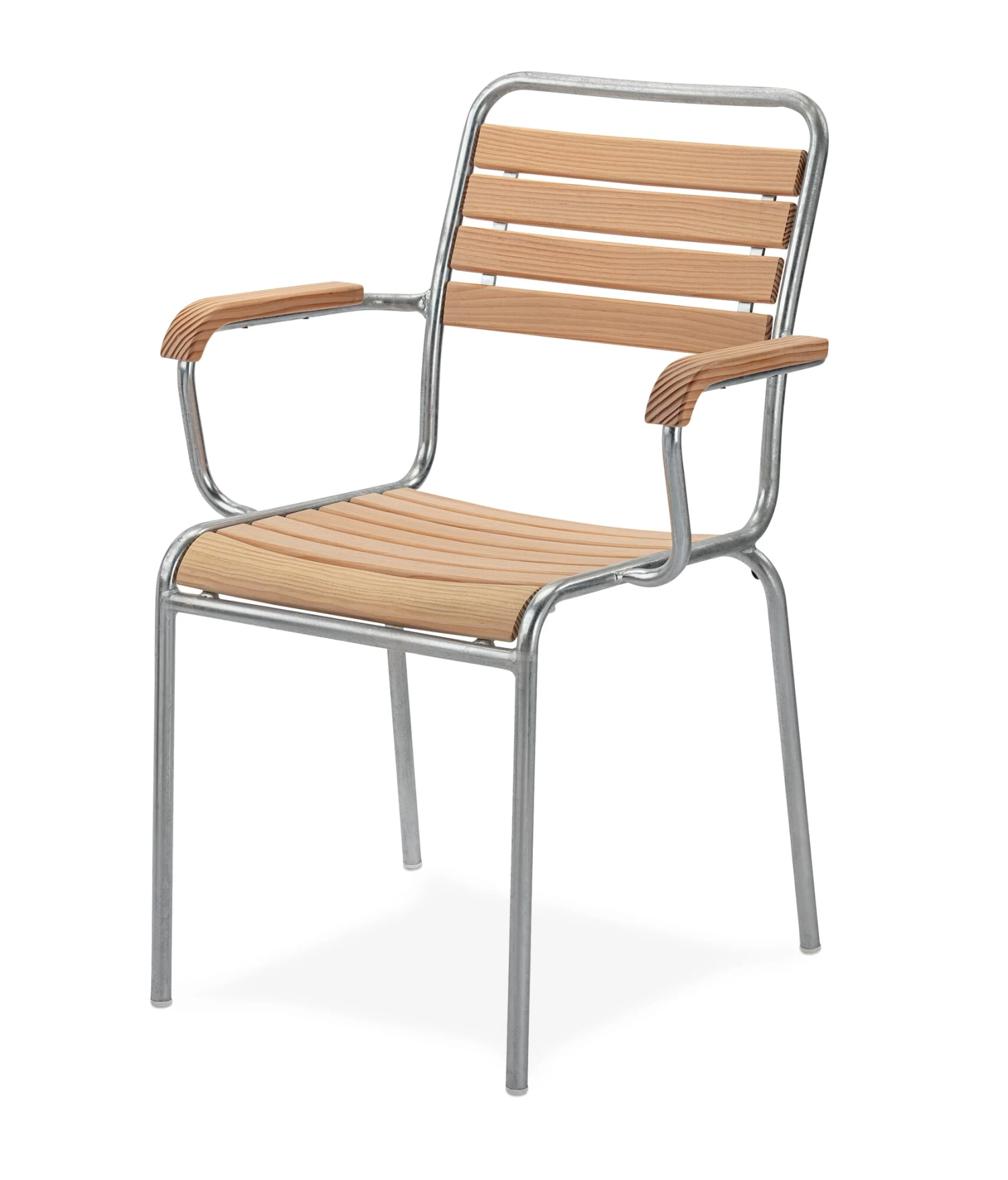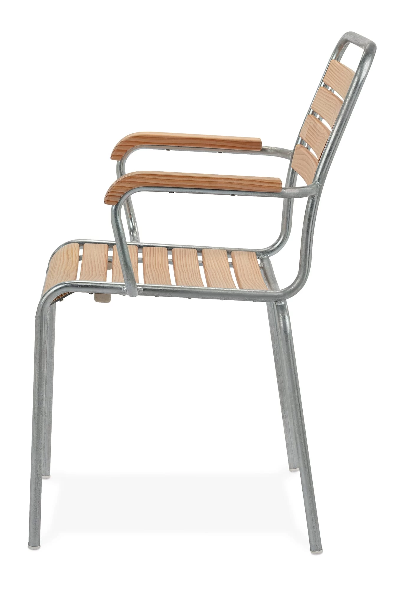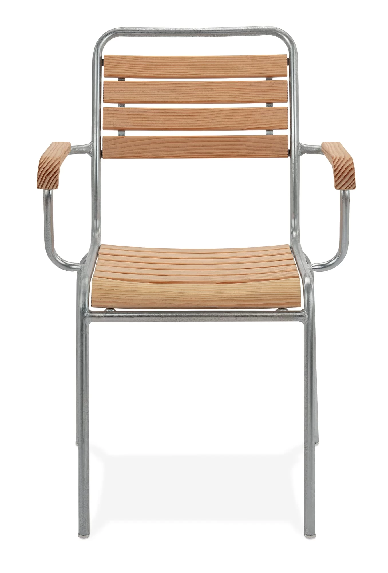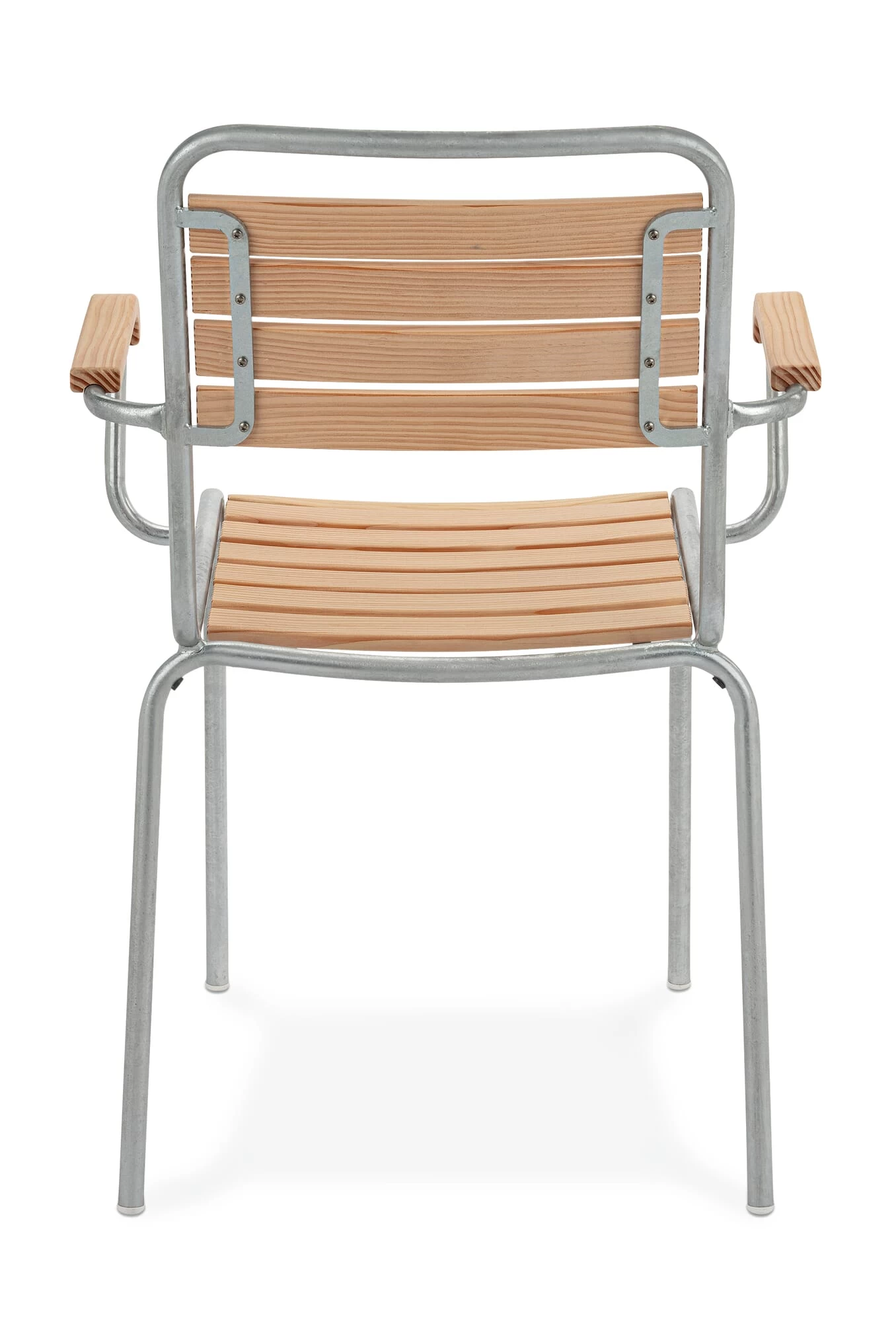 Afmetingen: B 59 × D 59 × H 85 cm, zithoogte: 45 cm – stapelbaarGewicht: 7 kgMateriaal: Frame: staal, thermisch verzinkt; planken: douglas (herkomst: Zwitserland)