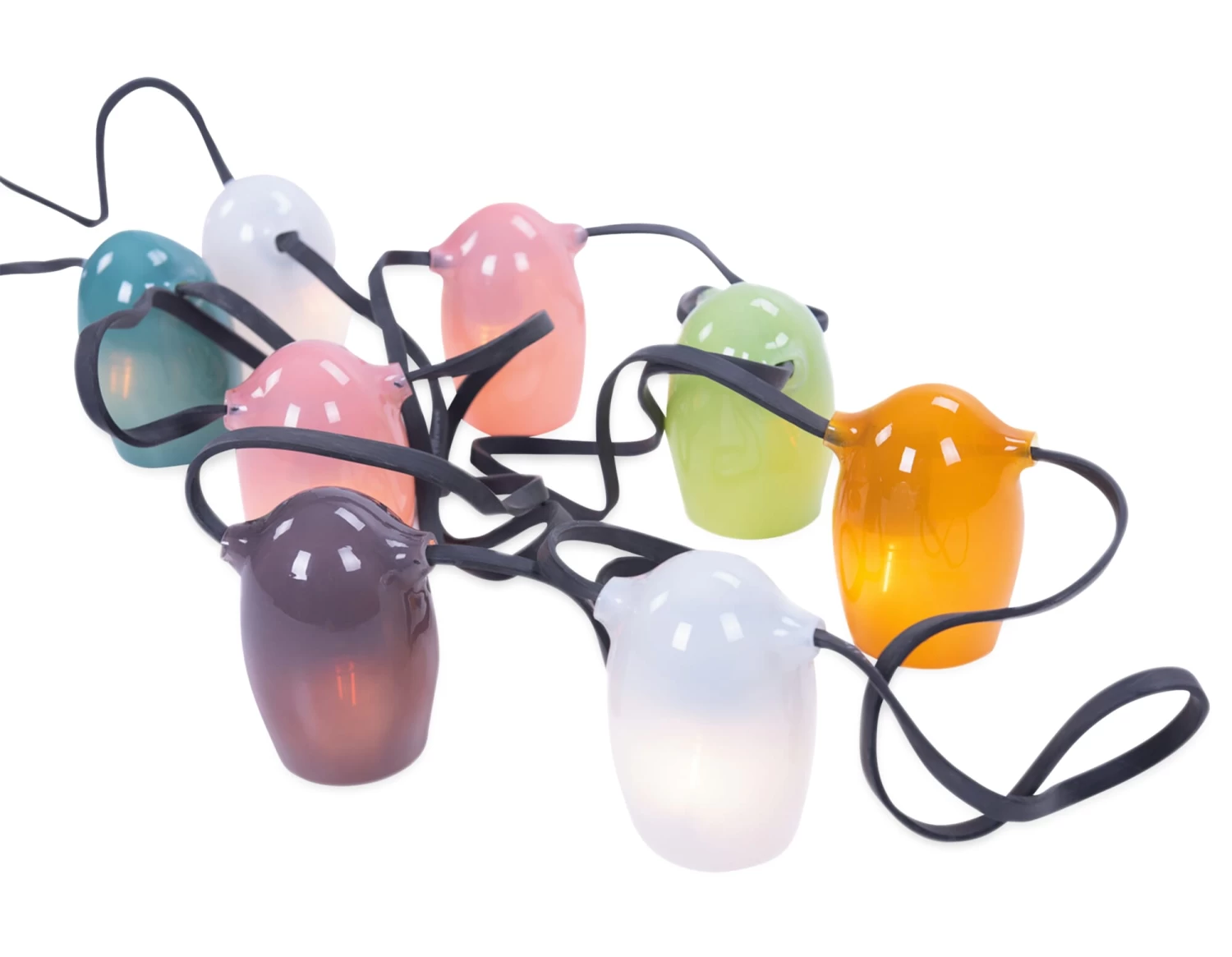 De STRINGLIGHT lichtketen bestaat uit acht armaturen van mondgeblazen glas die achter elkaar zijn gemonteerd. De opaalwitte of gekleurde glazen zorgen voor een zacht en sfeervol licht rondom, waarbij het zwaartepunt van het licht door de open lampenkappen naar beneden wordt uitgestraald. De effen versie schittert in de kleuren opaal, roze, groen, savanna, Braun en lichtgroen. De armatuur biedt licht boven zitgedeelten en tafels en is geschikt voor permanent gebruik buiten in overdekte ruimten. Beschermingsklasse: IP44. Stopcontact: E27. Lamp niet inbegrepen. Stroomverbruik: max. 15 W.