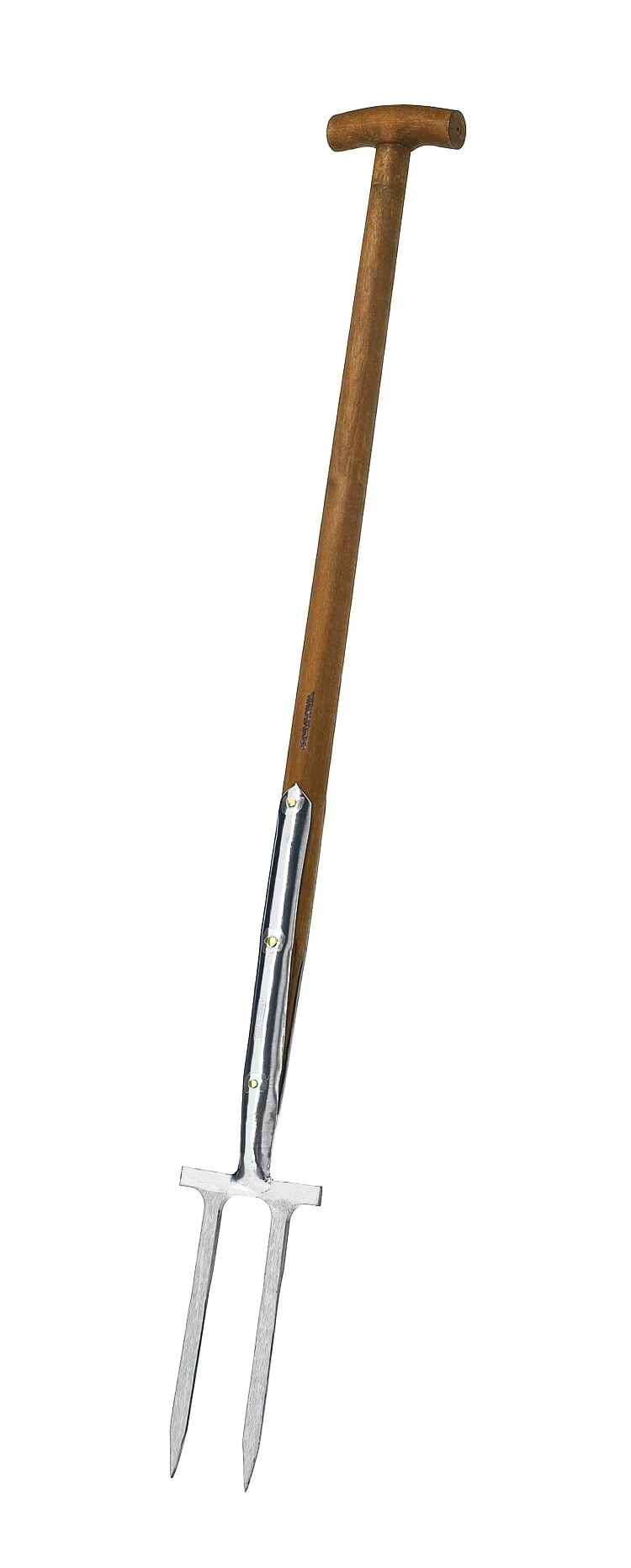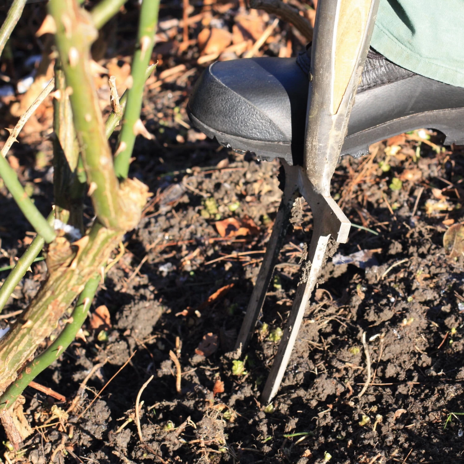 De tweesnijdende rozenvork is een beproefd hulpmiddel voor het verzorgen van rozen. Met de twee sterke, extra lange tanden kan zelfs leemachtige grond voorzichtig worden losgemaakt en belucht tot aan de diepe penwortels van de planten.