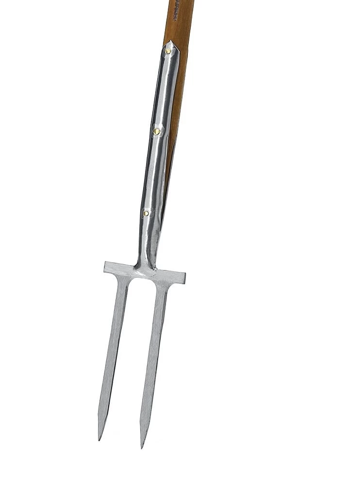 Handgesmeed roestvrij staal. Ashouten handvat. Met twee tanden, lengte 24 cm, afstand 5,5 cm. Gemaakt in Nederland. Totale lengte 119 cm, breedte 14 cm. Gewicht 1,6 kg.