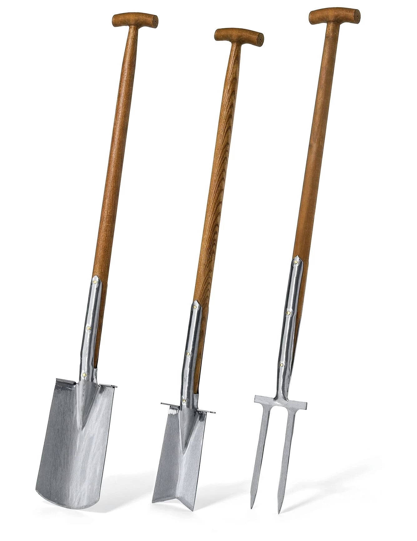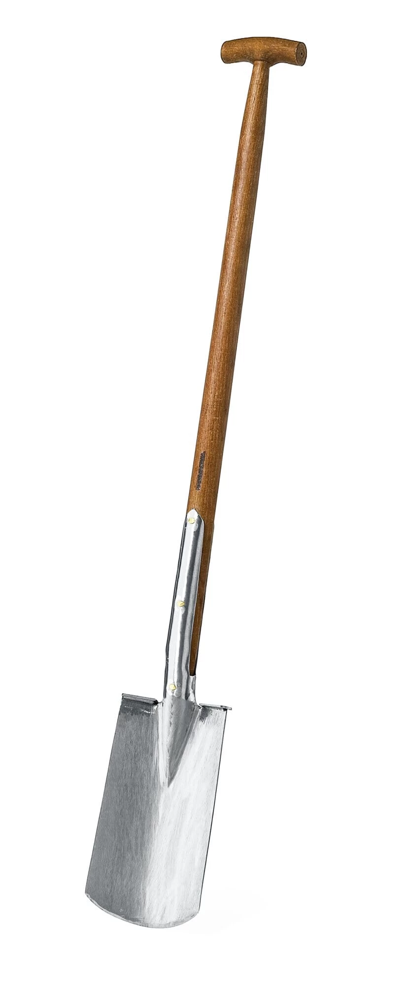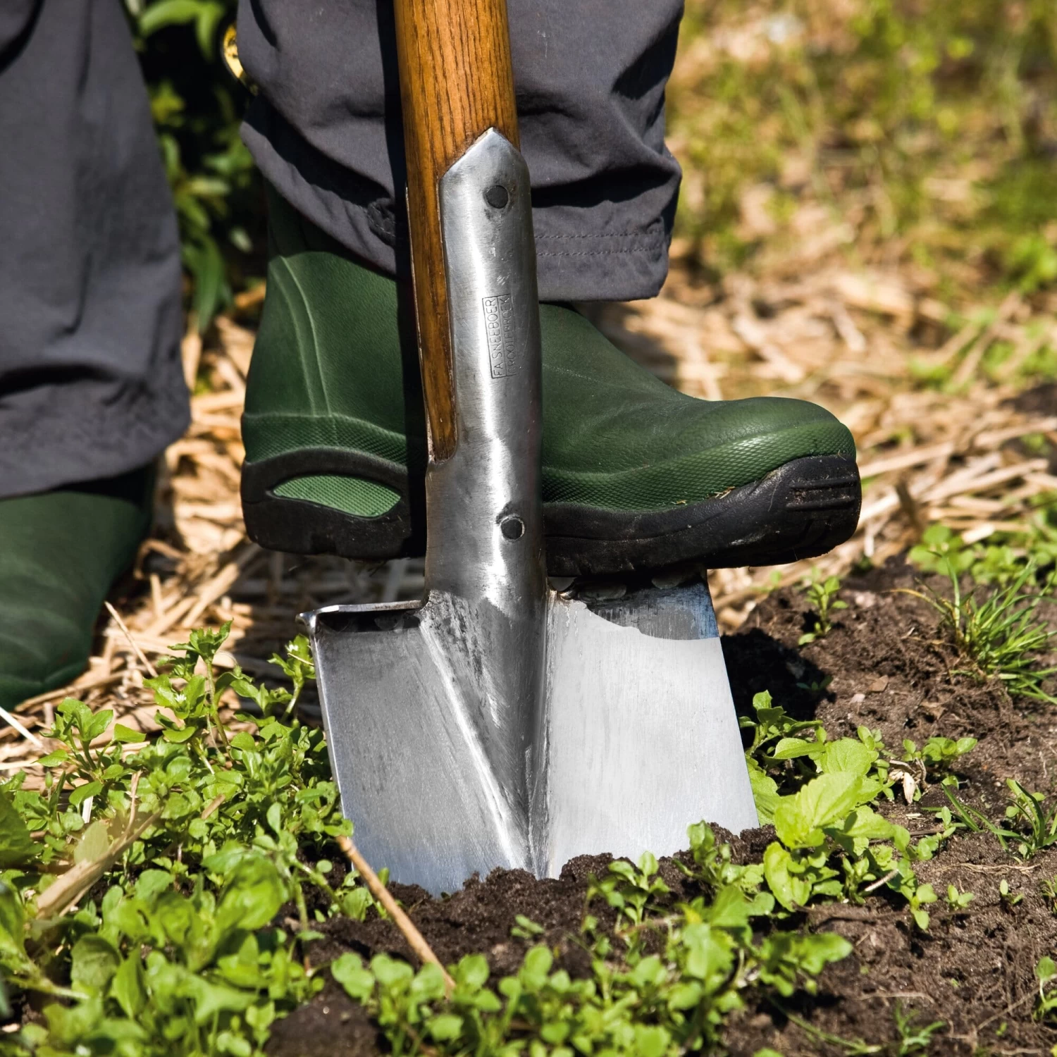 In de klassieke vorm van de “Engelse tuinspade”. Naast vele andere toepassingen is de spade onvervangbaar voor het verdelen van vaste planten, het graven van grote plantgaten, het afsnijden van randen van perken of het ontginnen van eerder ongebruikte gebieden.