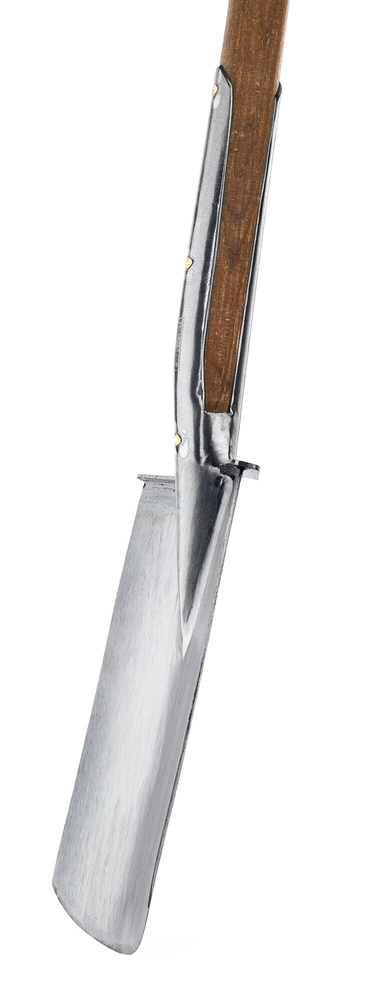 Lemmet handgesmeed roestvrij staal, met treden (ter bescherming van de schoenzolen), 28 x 16 cm. Handvat essenhout, geolied. Gemaakt in Nederland. Totale lengte 1,14 m. Gewicht 2,1 kg.