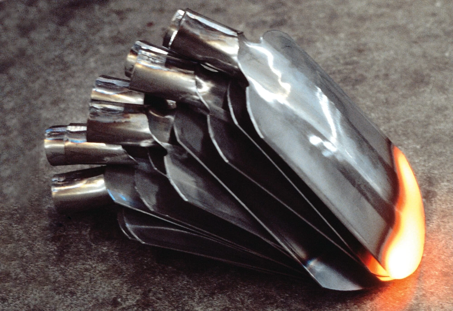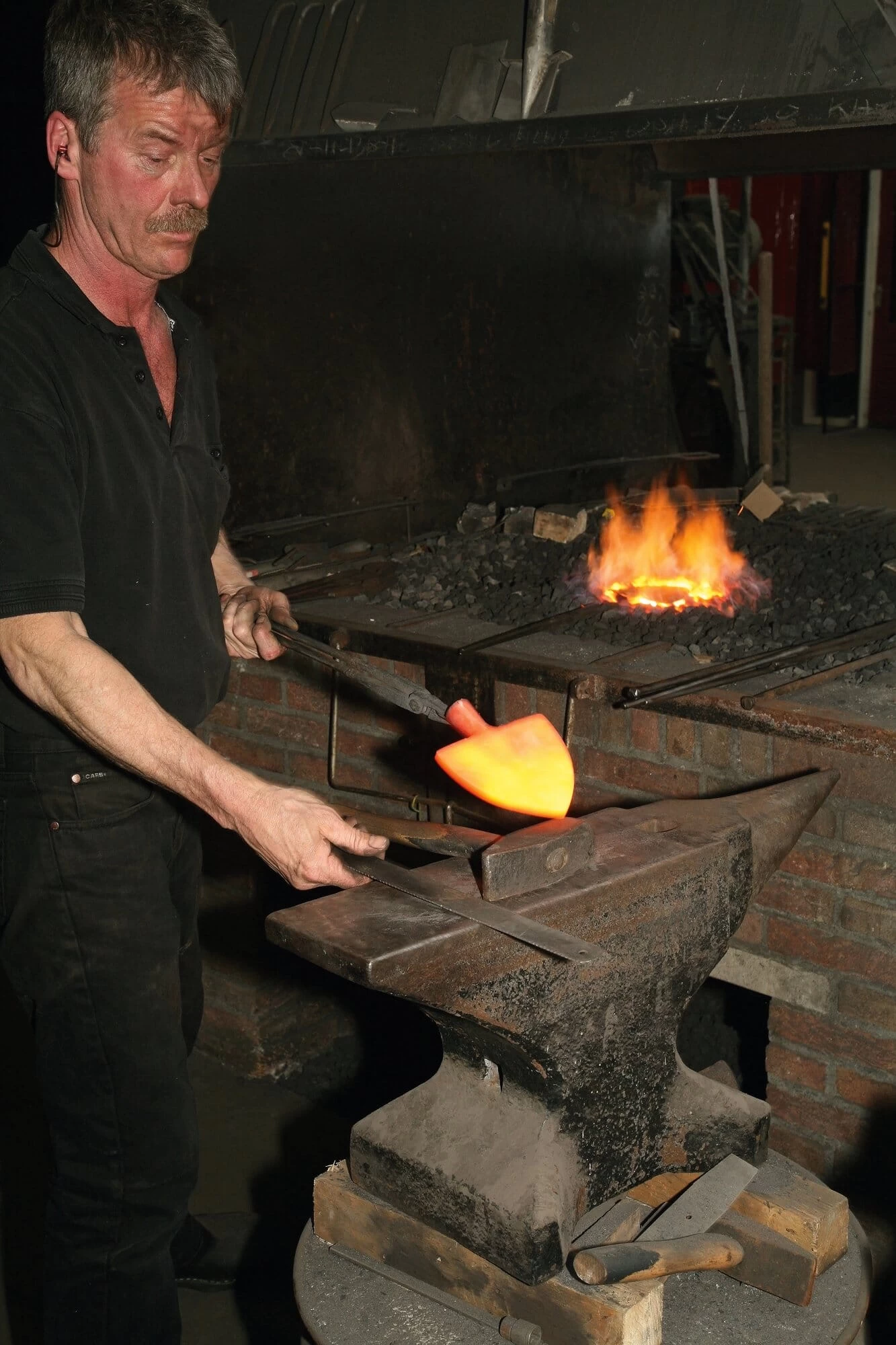 Wij laten bij Sneeboer in Noord-Holland twee verschillende roestvrije staalsoorten verwerken: een hoger gelegeerde, taaiere voor de veren en tules van de greephouders en een lager gelegeerde, beter smeedbare voor de functionele delen. Wij hebben de veren en tules van al het gereedschap laten verlengen, wat meer stabiliteit garandeert tijdens het werk en minder risico op breuk van het onberispelijke handvat. De zeilringen zijn permanent en veilig bevestigd met messing klinknagels.