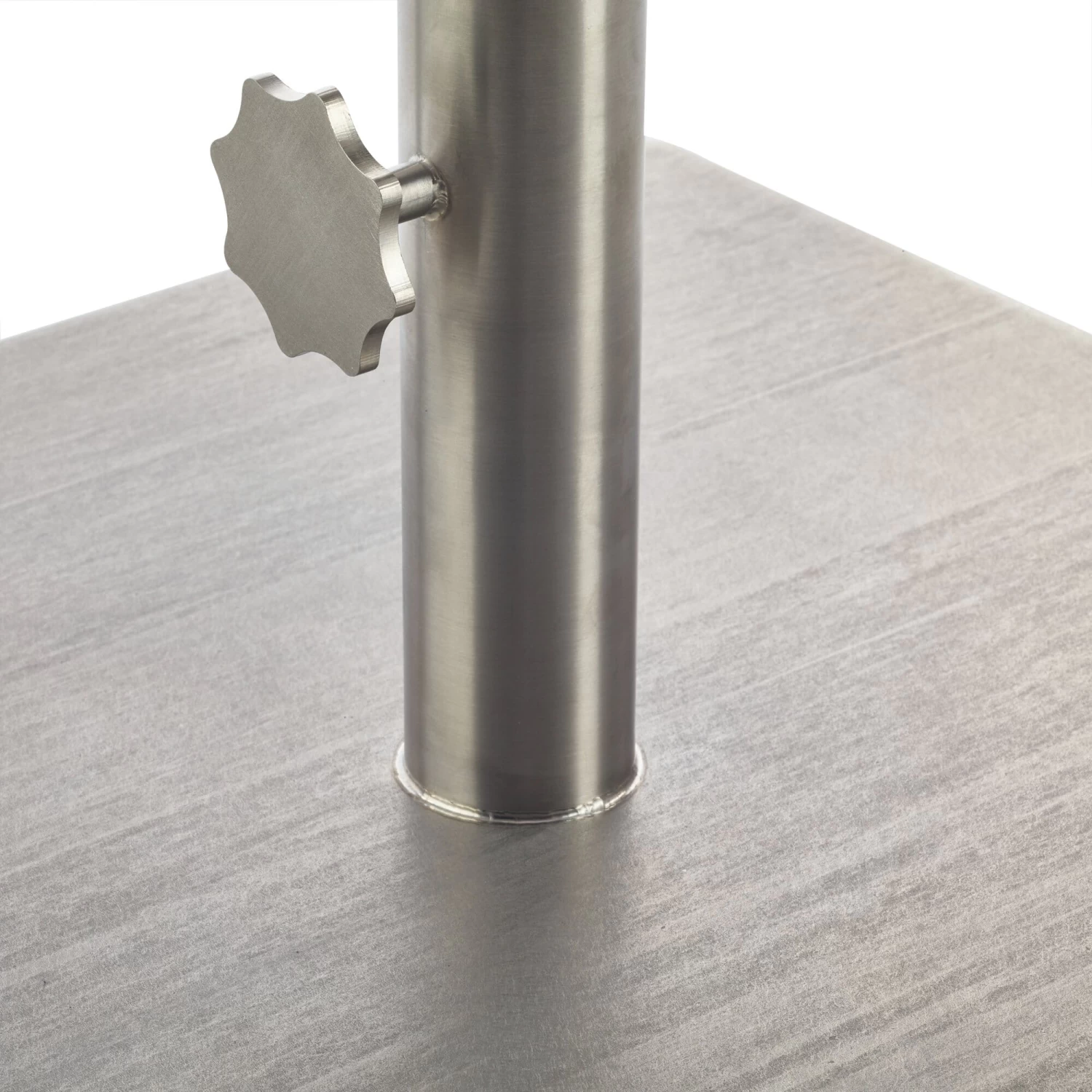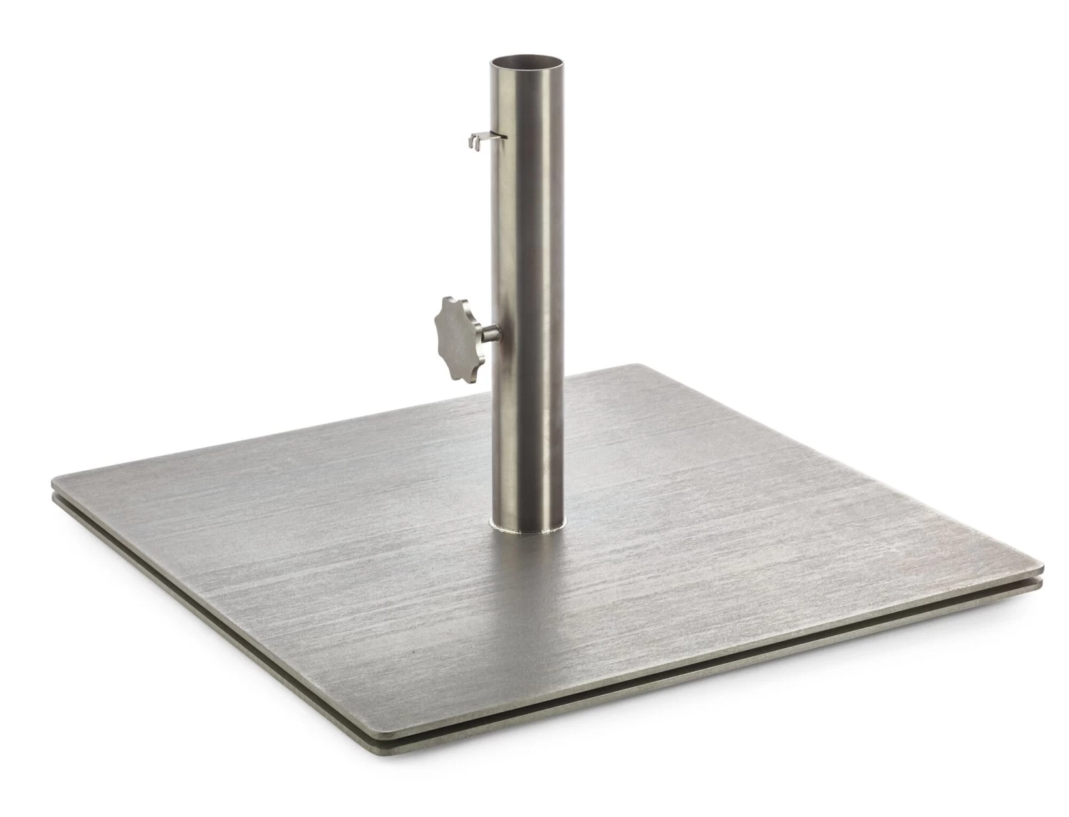 Voor palen met een Ø van 2,9 tot 4,2 cm. Gemaakt van roestvrij staal, gematteerd, buis roestvrij staal helder, voeten plastic. 49 x 49 cm, hoogte 33,5 cm. Gewicht 30 kg.
