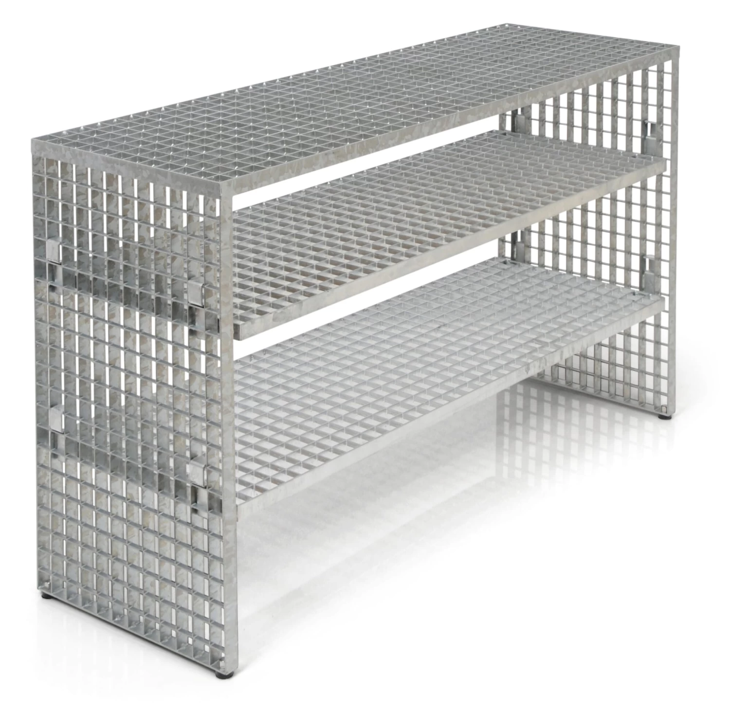 Met hoeken en randen en in onverwoestbare industriële kwaliteit: dit losse schap vult de bank of tafel van de serie aan en creëert extra opbergruimte wanneer het meubel als schap wordt gebruikt. Met een paar eenvoudige handelingen en de hulp van vier gegalvaniseerde bevestigingsklemmen (bij de levering inbegrepen) worden de elementen in elke gewenste positie geplaatst. De plank kan worden gebruikt als rugleuning op elke SKWER bank met een apart verkrijgbare beugelset.