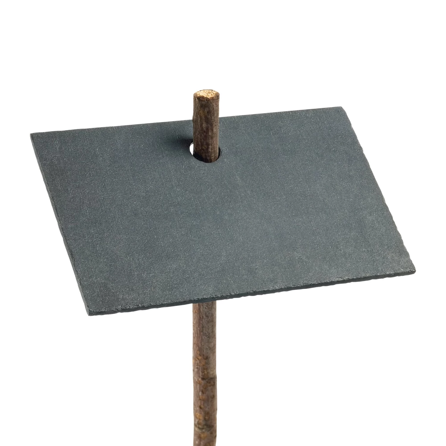 Rustieke plantenborden van 2 mm dik leisteen, stijlgetrouw en permanent beschrijfbaar met de bijgeleverde leisteenstift. Met gat om op te hangen of aan een stok te bevestigen. (Op natte leisteen verdwijnt het schrift visueel, maar “verschijnt” het weer als het opdroogt).