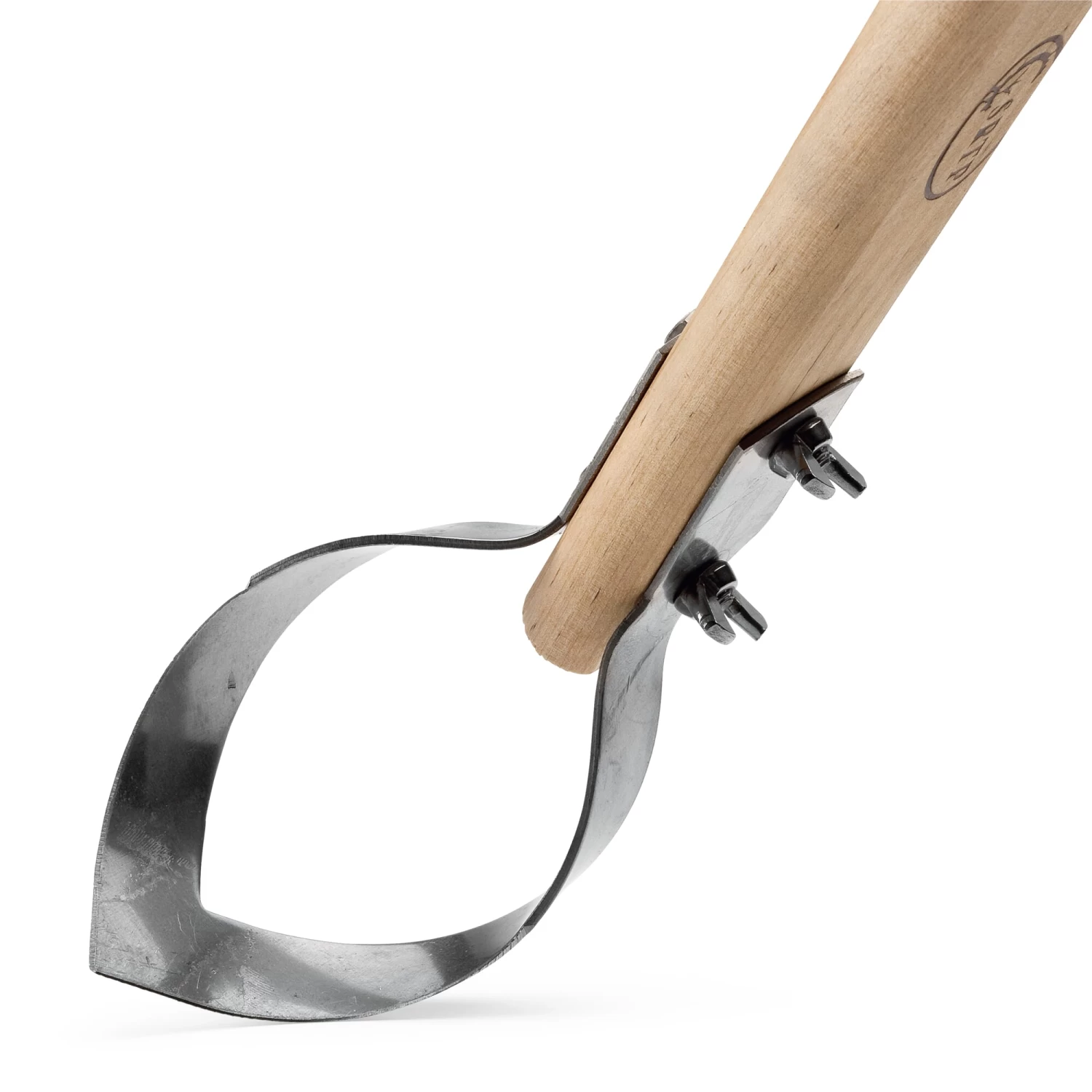 Deze zogenaamde platte frees is ook een zeer veelzijdig tuingereedschap. Als het blad bijvoorbeeld naar de grond wijst, wordt het gebruikt voor grondig losmaken en schoffelen, en zelfs groter geworden onkruid kan dan gemakkelijk worden verwijderd. Als het blad 180° wordt gedraaid, kan het gereedschap worden gebruikt als een “schop”, d.w.z. een duwschoffel die van het lichaam af over de grond wordt geduwd en waarmee ondiep wortelend onkruid bijzonder krachtig kan worden aangepakt. Wildgroei of groter onkruid kan in een zijwaartse beweging worden “gezeefd”, minder hardnekkig, ondiep wortelend onkruid kan zonder veel moeite worden ondergraven (bovengrondse plantendelen kunnen worden achtergelaten als organische meststof). Voor het ophogen van groenteplanten wordt het blad 90° gedraaid, zodat het lange snijvlak vlak ligt.