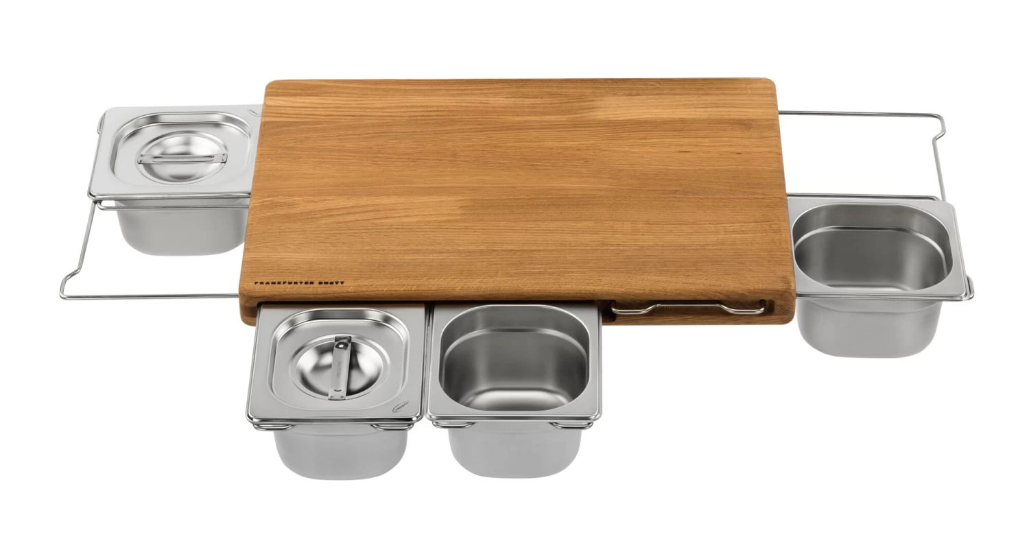 In restaurantkeukens of grootkeukens worden deze universele roestvrijstalen bakken, die gestandaardiseerd zijn volgens de DIN-EN-631 norm, praktisch voortdurend gebruikt voor het bereiden, koken en serveren van voedsel en bij het buffet. In onze combinatie – met de Frankfurter Brett – dienen ze vooral om al het werk voorafgaand aan het koken en de “keukenlogistiek” te vereenvoudigen. De Gastronorm bakken zijn zo gedimensioneerd dat het grotere bodemoppervlak telkens een veelvoud is van het kleinere. Ze zijn robuust, duurzaam (omdat ze corrosiebestendig zijn), temperatuurbestendig, gemakkelijk te reinigen, geur- en smaakloos en kunnen aan het einde van de levensduur van een keuken zelfs worden gerecycled in schroot. De bakjes kunnen in de (koel)kast of op de keukenplank worden gestapeld en nemen dan weinig ruimte in, zelfs in grotere aantallen.