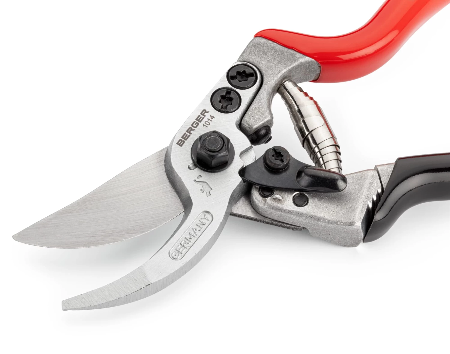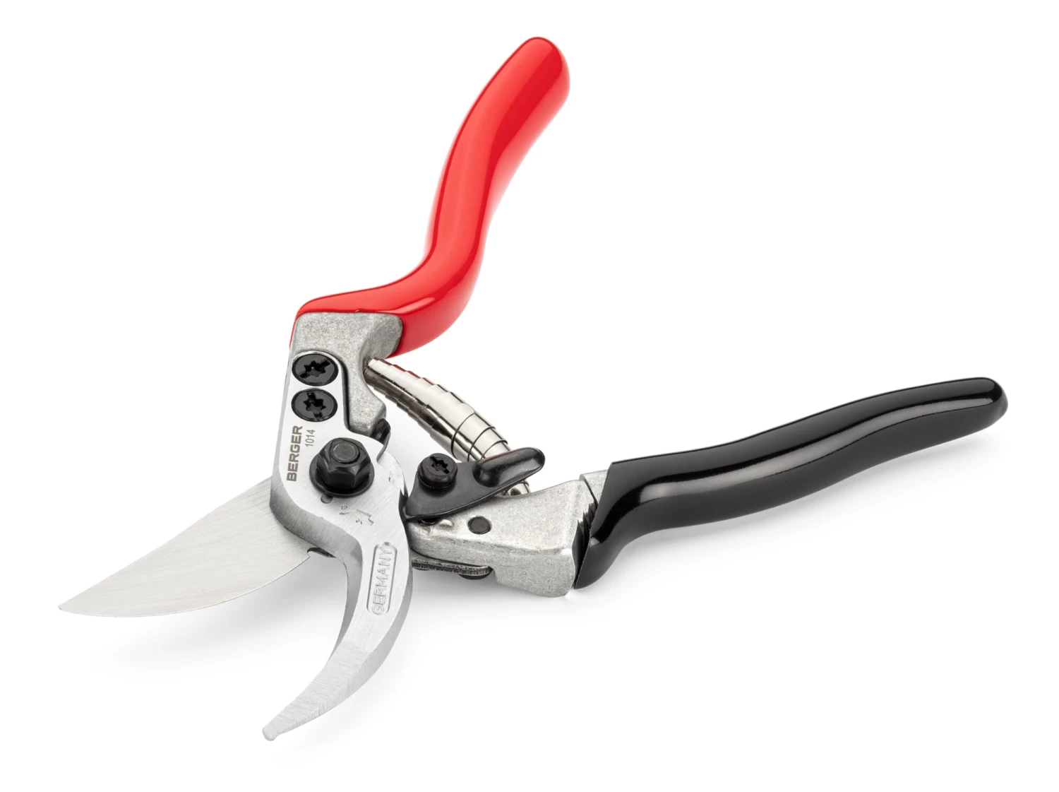 De vaste steelpoot van deze compacte rozen- en struikschaar rust op de bal van de hand, terwijl de beweegbare rolt met de open- en sluithand. Enerzijds vermindert dit de wrijving van het handvat op de huid, anderzijds – zodra u een beetje geoefend bent in het gebruik van deze schaar – betekent dit ook een energiebesparing van ongeveer 30 procent. Bij dit model uit het assortiment van scharenspecialist Berger uit Wuppertal is de meskop 15° gekanteld, wat een ergonomische handpositie mogelijk maakt in de zin van extra werkgemak. En als u met deze schaar eerder korte, dunne takken wilt knippen, kunt u een tussenvergrendeling inschakelen die de knipweg verkort – ook dan hebt u wat energie bespaard en kunt u uw snoeiwerk in de tuin ontspannen voortzetten. Ook het lage gewicht van de handgrepen van gesmeed aluminium draagt daaraan bij.