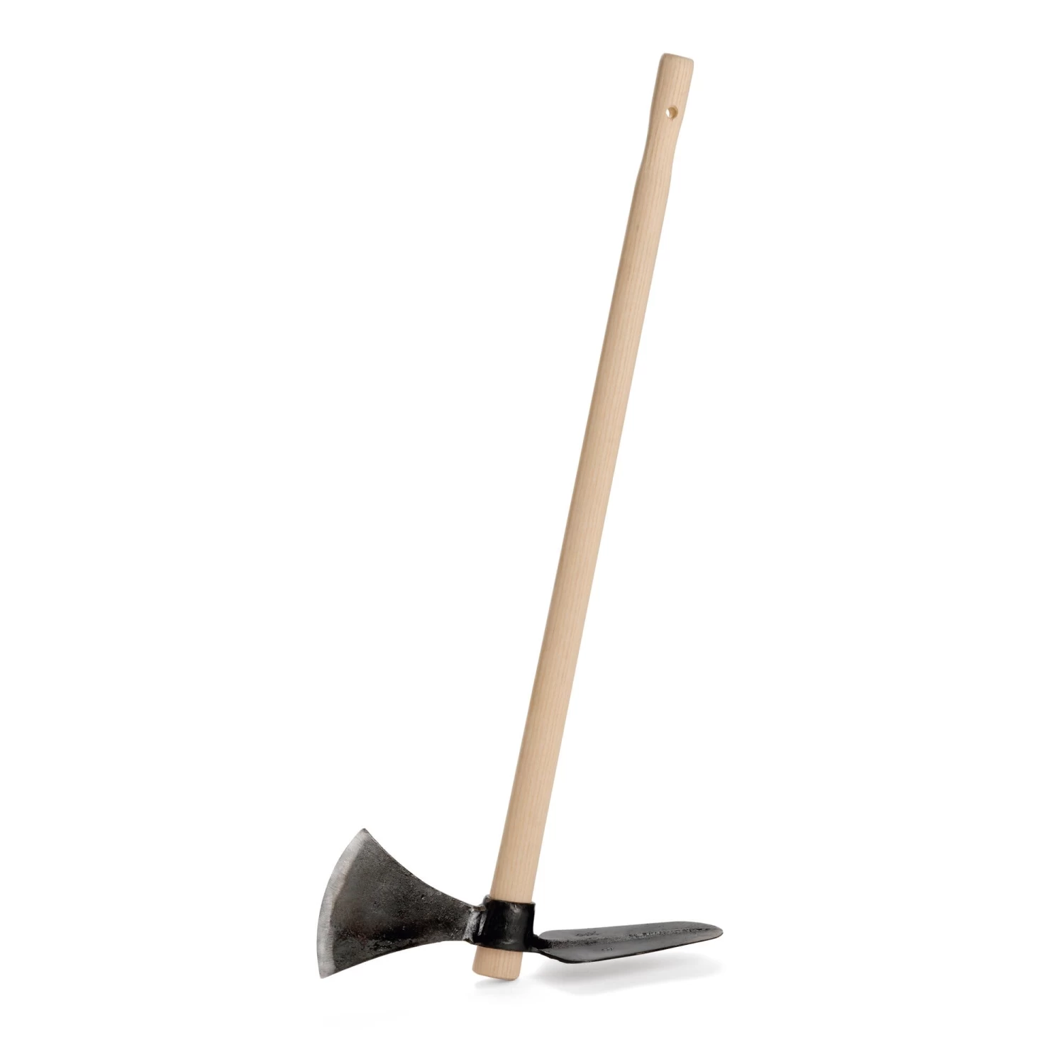Koolstofstaal. Handvat essenhout (herkomst Duitsland), geolied. Gemaakt in Duitsland. 21 x 12,5 cm lemmet. Bijl 16,5 x 16 cm. Totale lengte 1,05 m. Gewicht 2,5 kg.