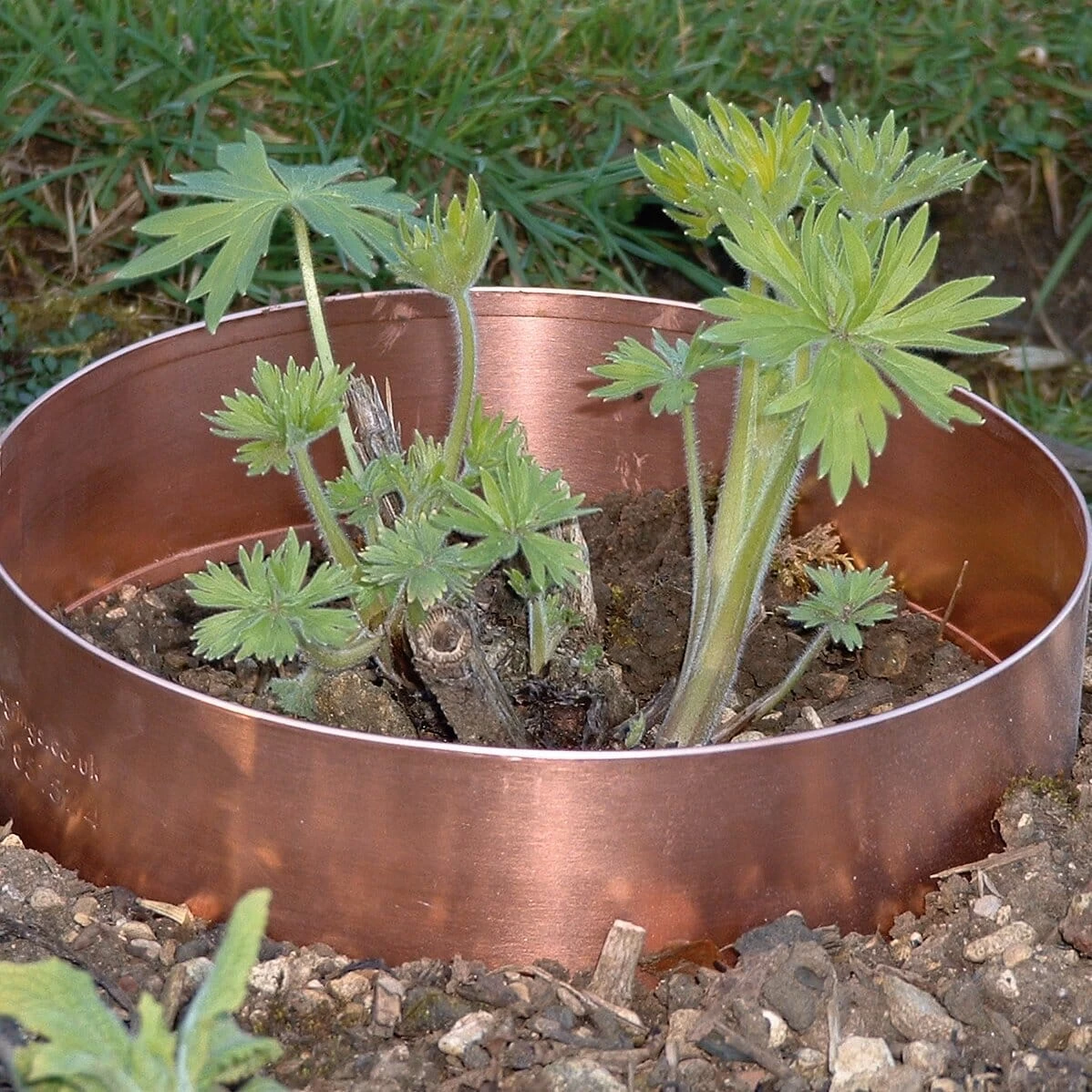 Deze ringen – die rond pas geplante of ontluikende planten in groentebedden, vaste planten en bloemperken worden geplaatst – hebben een eenvoudige, rechte vorm zonder profiel. Het enige belangrijke is het materiaal: zuivere kopertape, die over het algemeen door slakken wordt gemeden. Houd echter enkele dagen na de installatie in de gaten of er nog slakkeneieren worden gevonden binnen de koperen randen, en verzamel ze regelmatig.