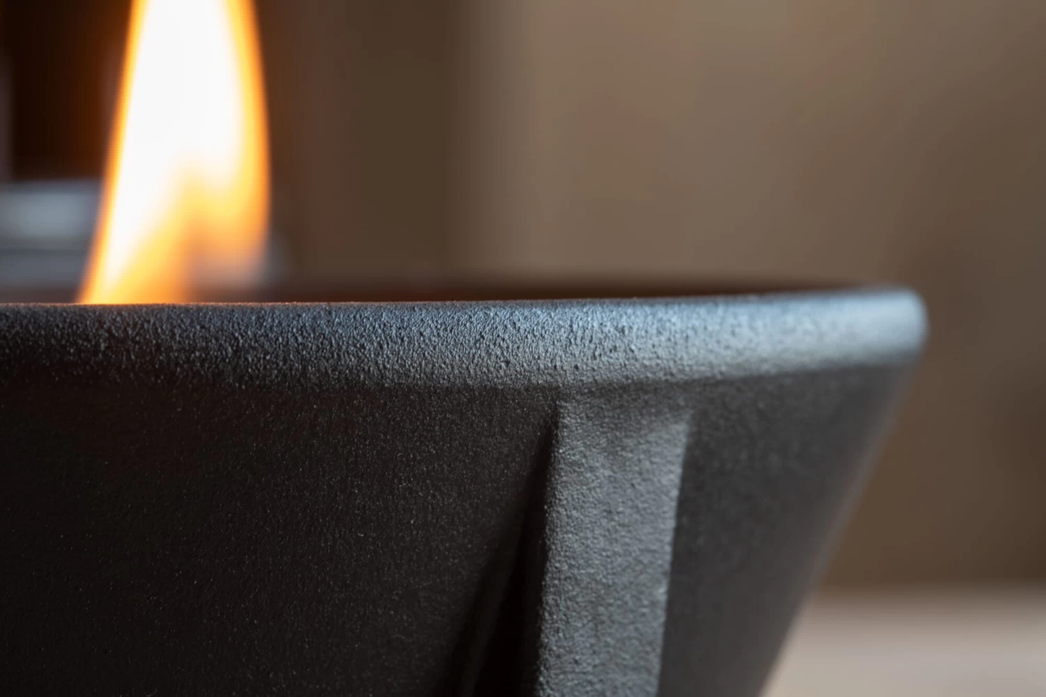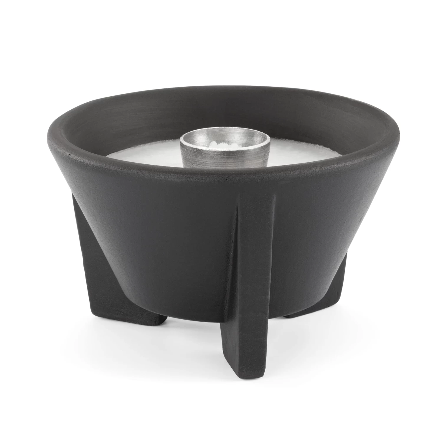 Klein: zwart gekleurd met lavazand, geglazuurd aan de buitenkant. Hoogte ca. 8 cm, Ø 13 cm. 880 g.