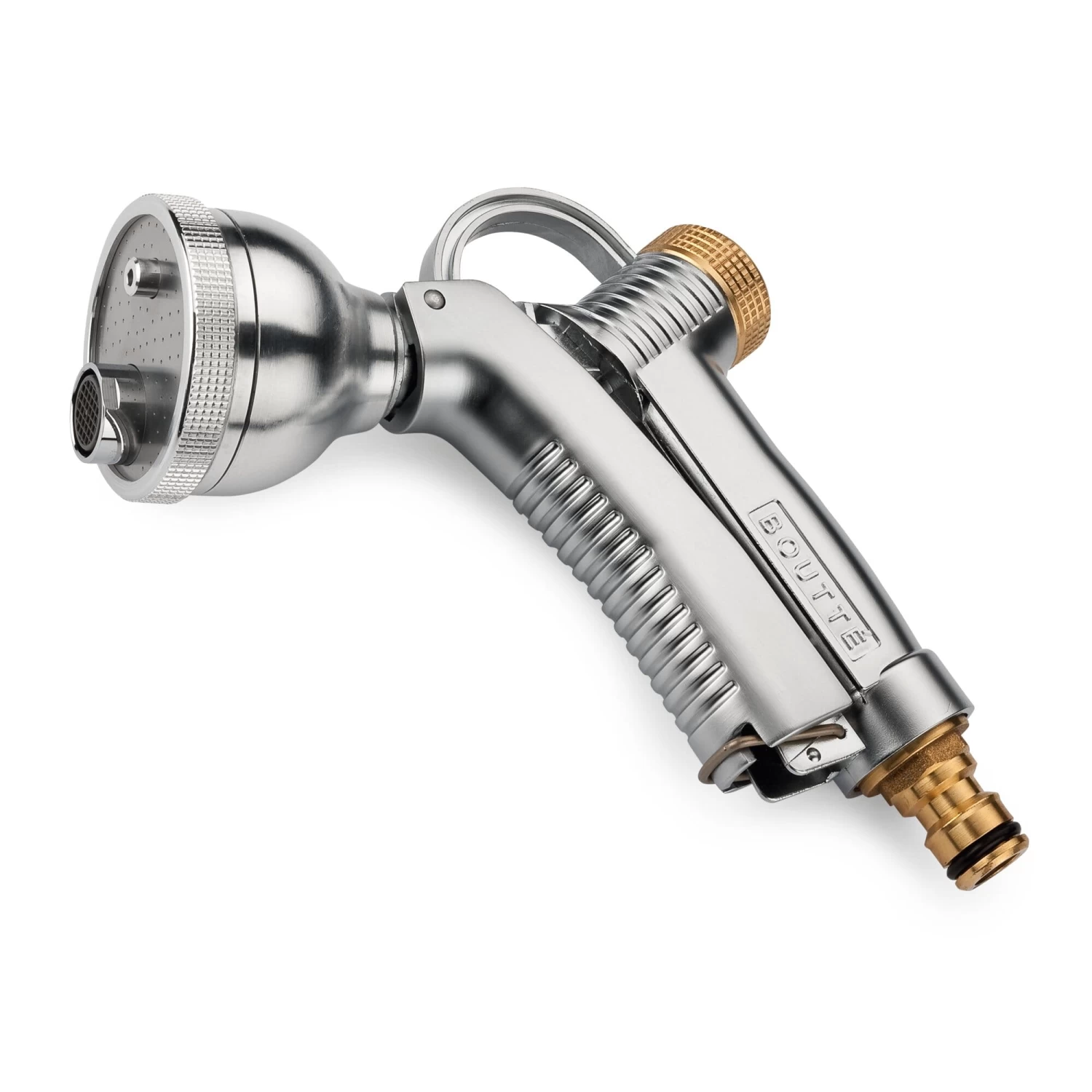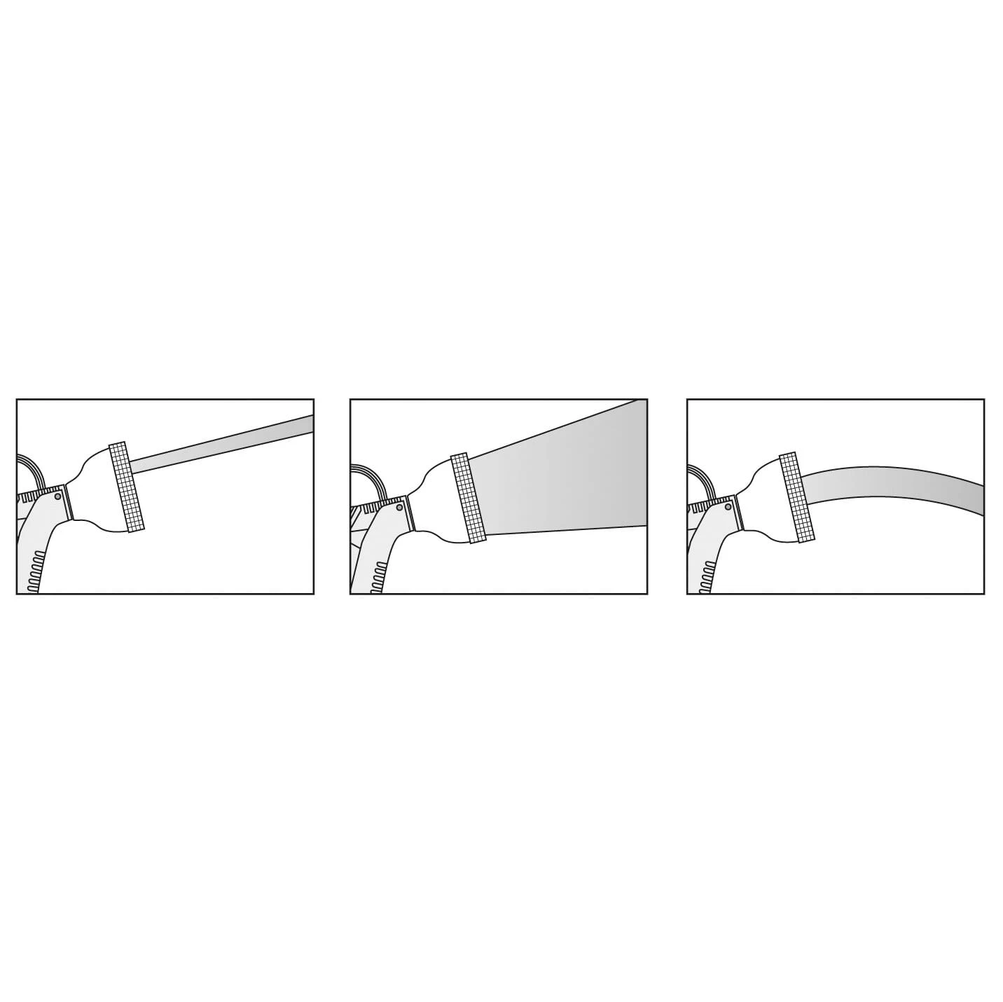 Met het draaiwiel op de sproeikop van dit besproeiingsapparaat kunt u naar wens verschillende sproeiers gebruiken. Hierdoor ontstaan drie verschillende sproeipatronen: de volle straal, waarbij het water uit vele afzonderlijke sproeiers tegelijk komt en die, net als een gieterstraal, geschikt is voor het besproeien van grote oppervlakken van perken; een zwakkere straal met een breed sproeipatroon, die nuttig is voor het plaatselijk, indringend besproeien van bijvoorbeeld potplanten; of een vrij smalle, maar hardere en zeer ver reikende waterstraal.