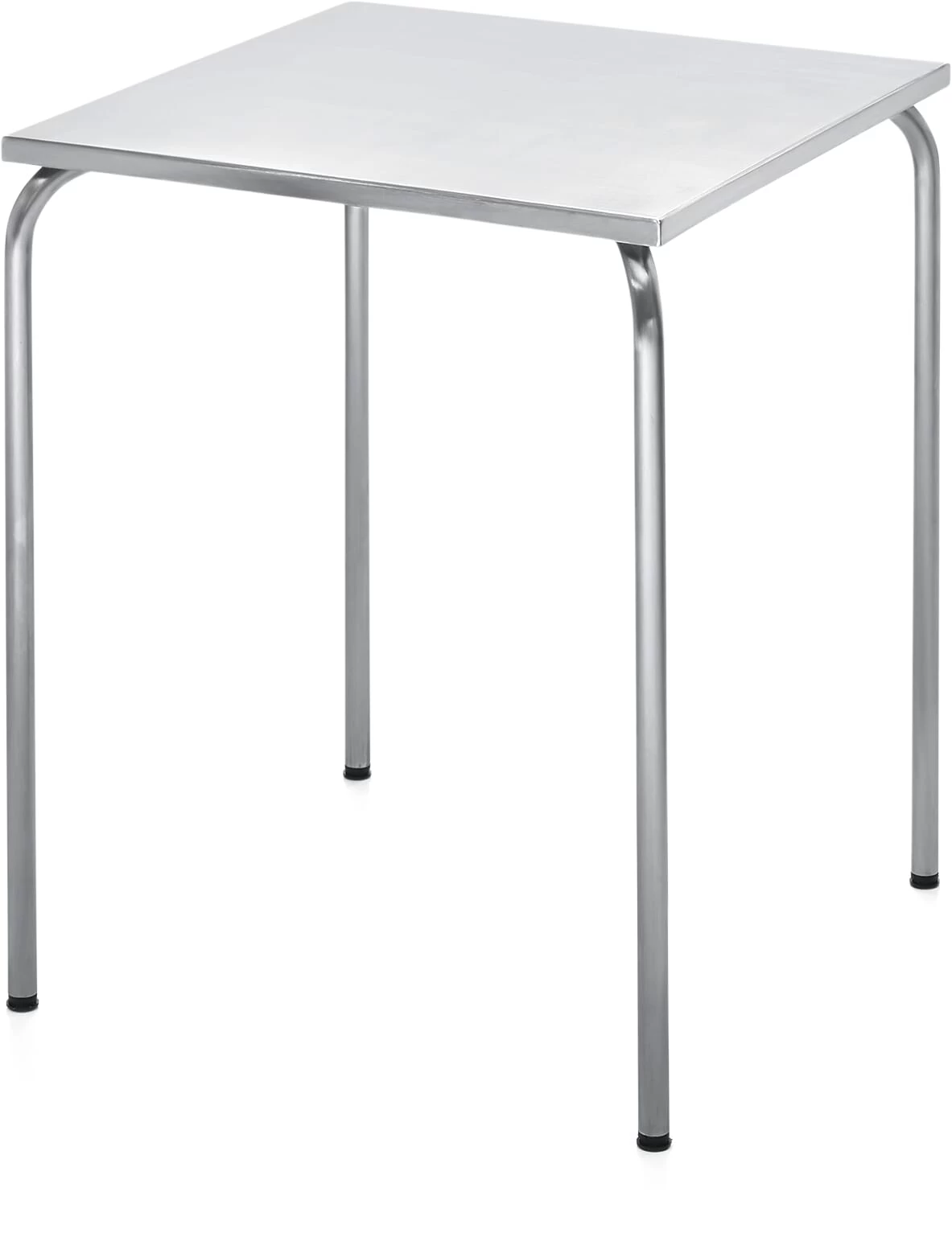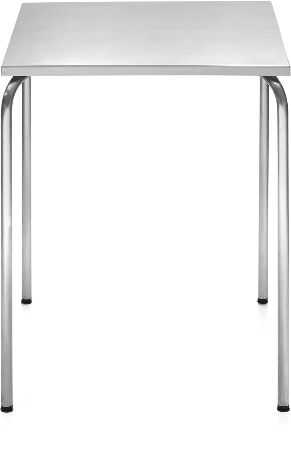 De kleine cafétafel voor de ESTORIL stoel – hier in roestvrij staal kwaliteit 316, een bijzonder resistente en onderhoudsvriendelijke versie dankzij het molybdeengehalte. Ook zeer geschikt voor gebruik in grotere aantallen: klein oppervlak, stabiele standaard en stapelbaar in offset.