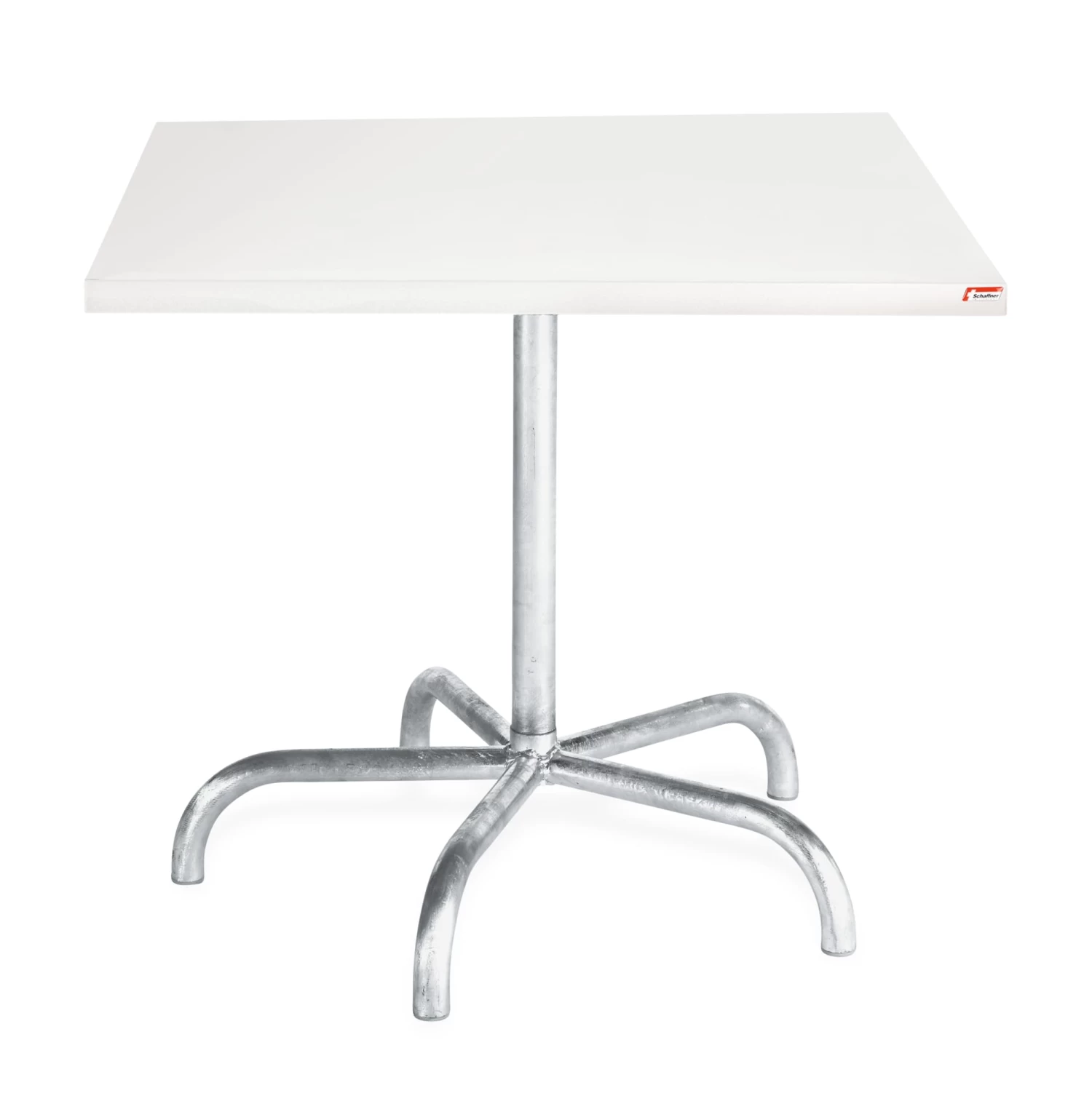 Robuuste vierkante tafel voor buiten. De tafel, voorzien van een thermisch verzinkt frame, is afkomstig van een Zwitsers familiebedrijf van de 3e generatie, gespecialiseerd in de vervaardiging van hoogwaardige buitenmeubelen. De bovenkant kan worden ingeklapt, heeft een beschermende vergrendeling en kan desgewenst in een handomdraai worden verwijderd om ruimte te besparen. In hoogte verstelbare plastic voetjes beschermen gevoelige oppervlakken. De tafel wordt gedemonteerd geleverd en kan met weinig moeite in elkaar worden gezet.