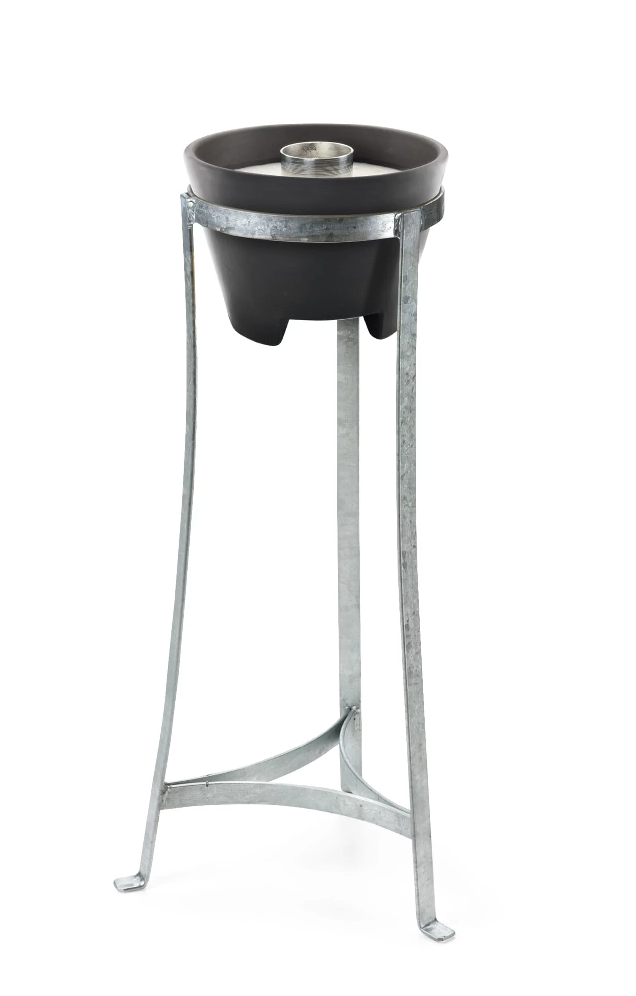 Bestaande uit een wasbrander – naar keuze lava zwart of naturel – en een bloempotstandaard van thermisch verzinkt staal, die weerbestendig is en ook als zodanig (overdag) kan worden gebruikt. Afmetingen van de standaard: hoogte 60 cm, voet Ø 34 cm. Gewicht 2 kg.